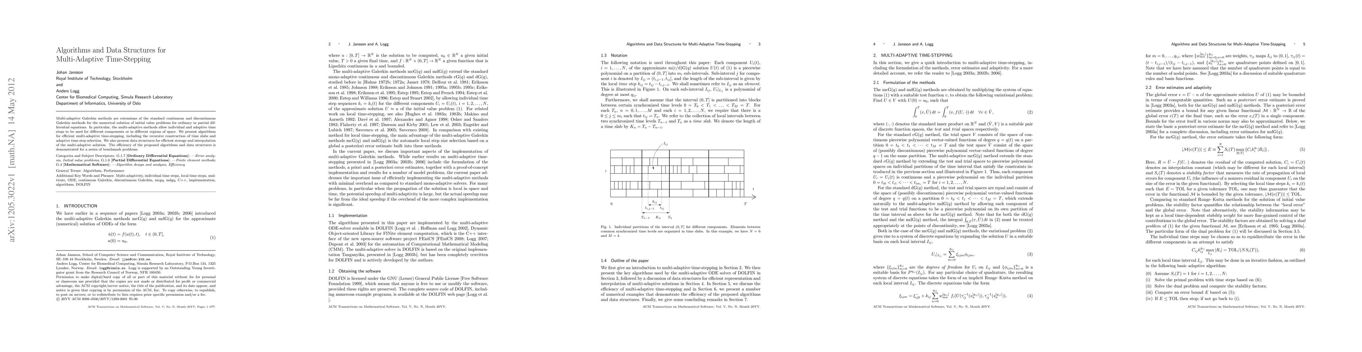 This paper introduces algorithms for efficient multi-adaptive time-stepping in Galerkin methods, enabling adaptive time steps for different components or regions. It also presents data structures for optimal storage and interpolation, validated through benchmark problems.