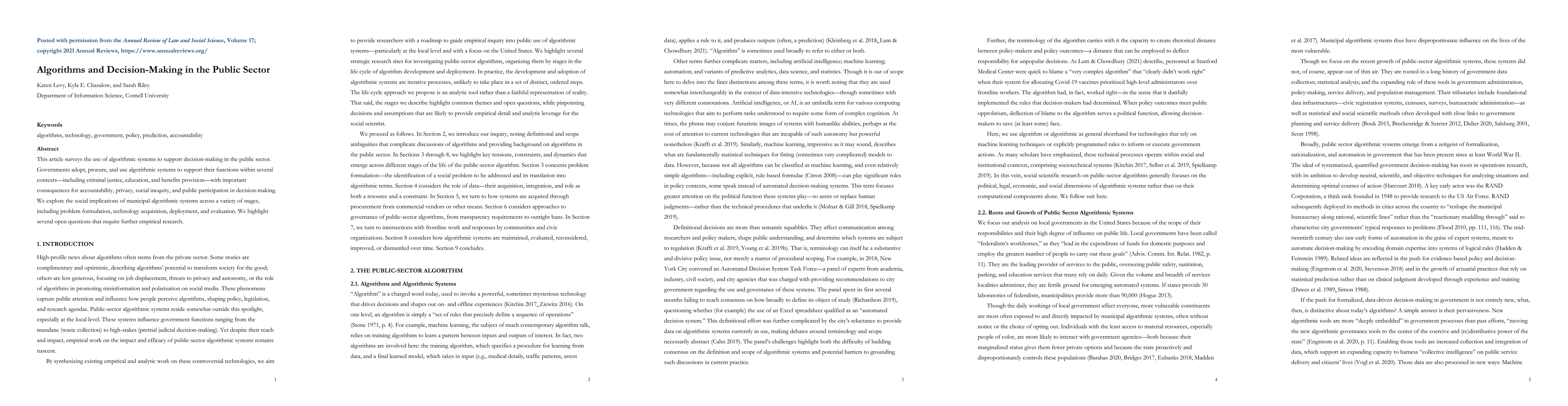 This paper surveys the deployment of algorithmic systems in public sector decision-making, examining their implications for accountability, privacy, and social equity across contexts like criminal justice and education. It identifies key stages and open questions for further empirical research.