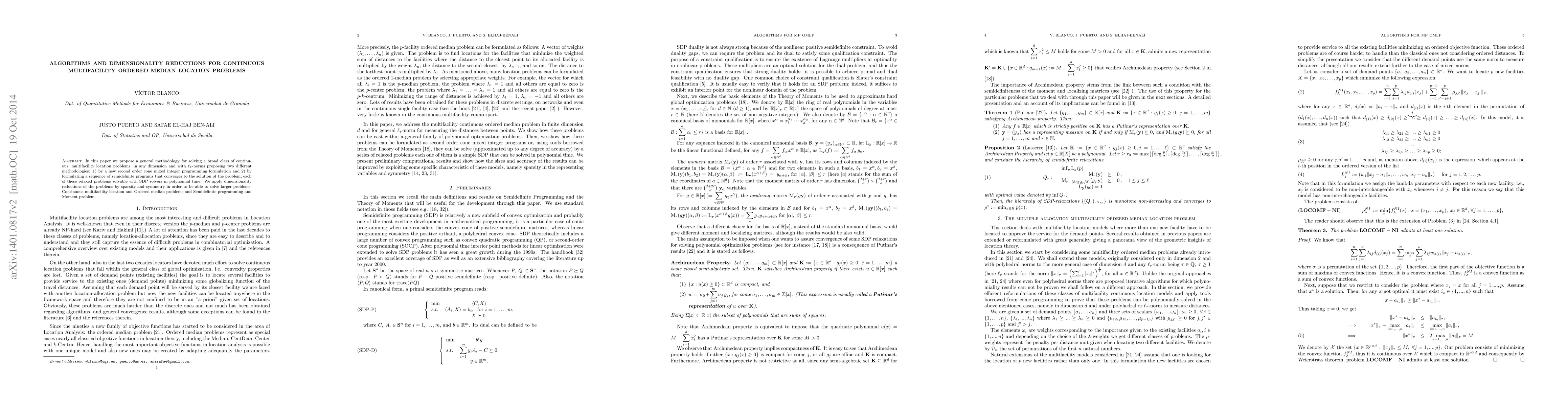 In this paper we propose a general methodology for solving a broad class of continuous, multifacility location problems, in any dimension and with $\ell_\tau$-norms proposing two different methodologies: 1) by a new second order cone mixed integer programming formulation and 2) by formulating a sequence of semidefinite programs that converges to the solution of the problem; each of these relaxed problems solvable with SDP solvers in polynomial time. We apply dimensionality reductions of the problems by sparsity and symmetry in order to be able to solve larger problems.