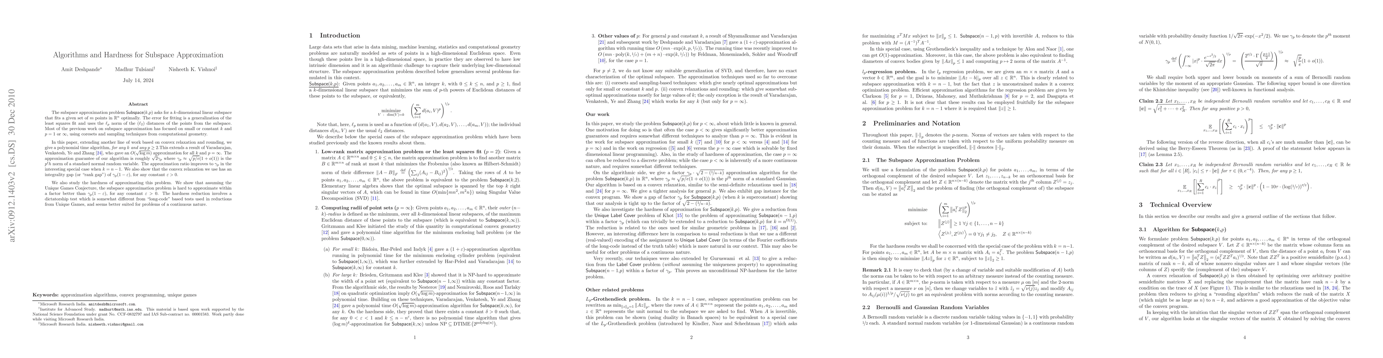 This paper presents a polynomial time algorithm for the subspace approximation problem with any k and p >= 2, providing an approximation guarantee of roughly u03c3_p * sqrt(2 - 1/(n-k)). It also demonstrates an integrality gap of u03c3_p * (1 - u03b5) for any constant u03b5 > 0. Furthermore, assuming the Unique Games Conjecture, the problem is proven to be hard to approximate better than u03c3_p * (1 - u03b5) for any constant u03b5 > 0.