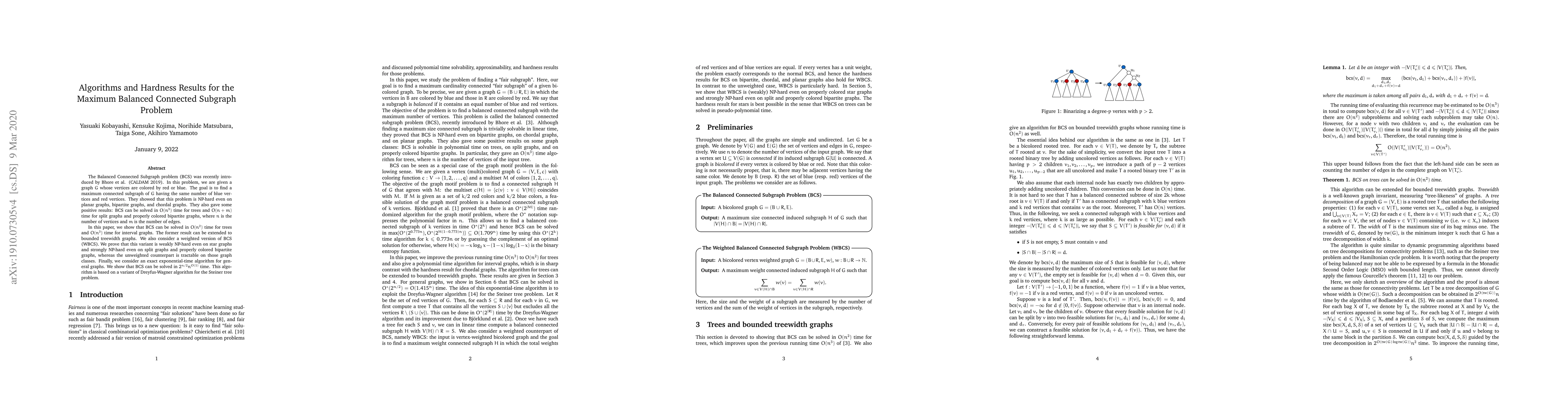 This paper discusses algorithms and hardness results for the Balanced Connected Subgraph (BCS) problem, showing $O(n^2)$ time for trees and $O(n^3)$ for interval graphs, extending to bounded treewidth graphs. It also presents a weighted BCS variant proven to be weakly NP-hard on star graphs and strongly NP-hard on split graphs, contrasting with the unweighted version's tractability. An exact exponential-time algorithm solves BCS in $2^{n/2}n^{O(1)}$ time.