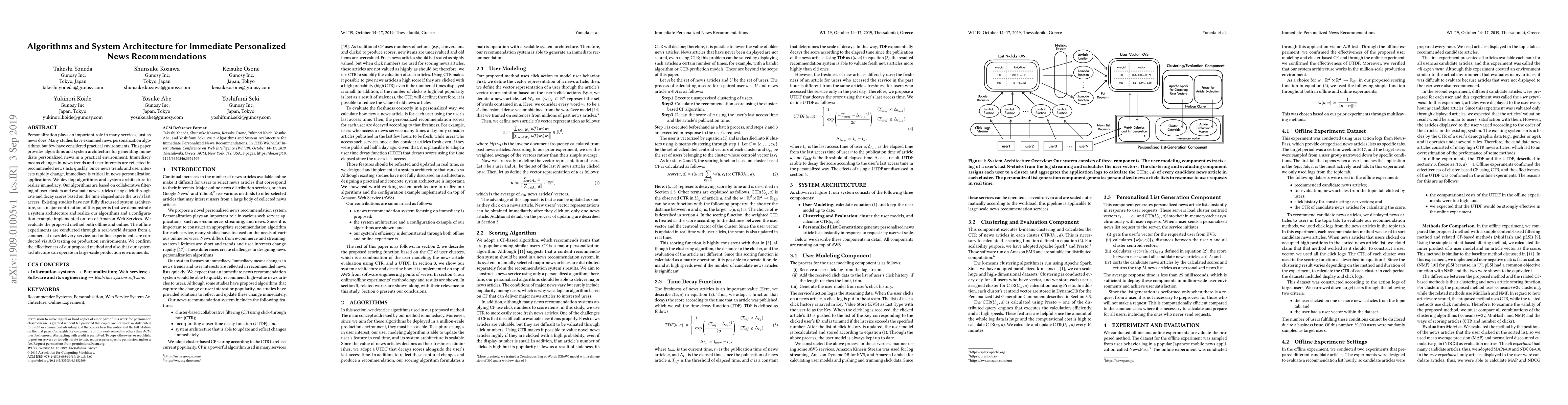 This paper presents algorithms and system architecture for generating immediate personalized news recommendations based on user clusters and article click-through rates, demonstrating its effectiveness in real-world environments.