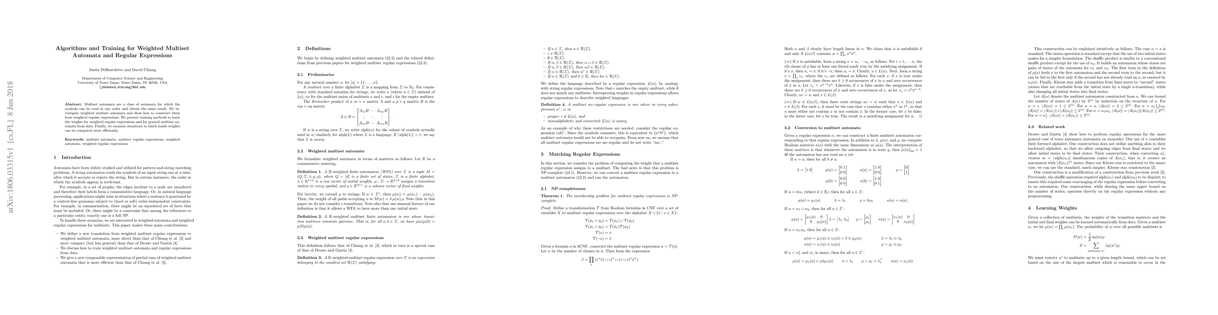 Multiset automata are a class of automata for which the symbols can be read in any order and obtain the same result. We investigate weighted multiset automata and show how to construct them from weighted regular expressions. We present training methods to learn the weights for weighted regular expressions and for general multiset automata from data. Finally, we examine situations in which inside weights can be computed more efficiently.