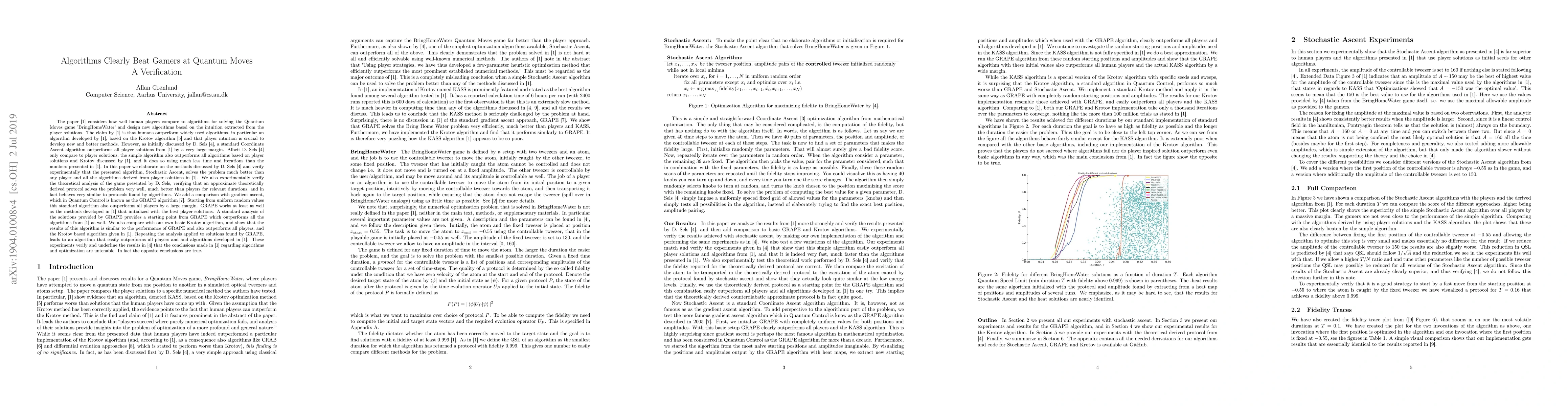 The paper [S{\o}rensen et al., Nature 532] considers how human players compare to algorithms for solving the Quantum Moves game BringHomeWater and design new algorithms based on the intuition extracted from players. The claim by [S{\o}rensen et al., Nature 532] is that players outperform widely used algorithms, in particular the KASS algorithm, based on the Krotov algorithm, and that player intuition is crucial to develop improved methods. However, as initially discussed by D. Sels [D. Sels, Phys. Rev. A 97], a standard Coordinate Ascent algorithm outperforms all players by a large margin. Albeit D. Sels only compare to player solutions, the simple algorithm outperforms all algorithms based on player solutions and Krotov, and it does so using much less time and iterations. In this paper we elaborate on the methods discussed by D. Sels and verify that the presented algorithm, solves the problem better than all players and algorithms derived from player solutions in [S{\o}rensen et al., Nature 532]. We also verify the theoretical analysis presented by D. Sels, that gives a theoretically derived protocol that outperforms all players. We add a comparison with gradient ascent or GRAPE. Starting from uniform random values, GRAPE outperforms all players by a large margin. GRAPE works at least as well as the methods from [S{\o}rensen et al., Nature 532] initialized with player solutions. A standard analysis of the results from GRAPE provides a starting point for GRAPE, that outperform all algorithms from [S{\o}rensen et al., Nature 532]. We compare with a basic Krotov algorithm, and get results similar to GRAPE, clearly outperforming players and the KASS algorithm. These experiments verify and underline the result in [D. Sels, Phys. Rev. A 97] that the conclusions from [S{\o}rensen et al., Nature 532] regarding algorithms are untenable. In fact the opposite conclusions are true.