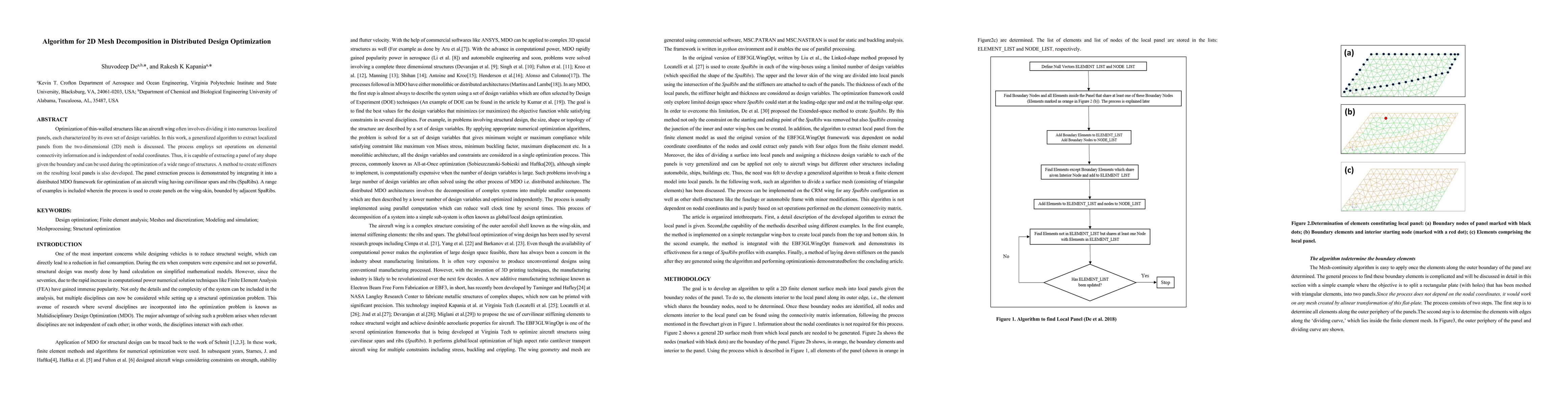 Optimization of thin-walled structures like an aircraft wing, aircraft fuselage or submarine hull often involves dividing the shell surface into numerous localized panels, each characterized by its own set of design variables. The process of extracting information about a localized panel (nodal coordinates, mesh connectivity) from a finite element model, input file is usually a problem-specific task. In this work, a generalized process to extract localized panels from the two-dimensional (2D) mesh is discussed. The process employs set operations on elemental connectivity information and is independent of nodal coordinates. Thus, it is capable of extracting panel of any shape given the boundary and thus can be used during optimization of a wide range of structures. A method to create stiffeners on the resulting local panels is also presented, and the effect of stiffener element size on buckling is studied. The local panel extraction process is demonstrated by integrating it into a distributed MDO framework for optimization of an aircraft wing having curvilinear spars and ribs (SpaRibs). A range of examples is included wherein the process is used to create panels on the wing-skin, bounded by adjacent SpaRibs.
