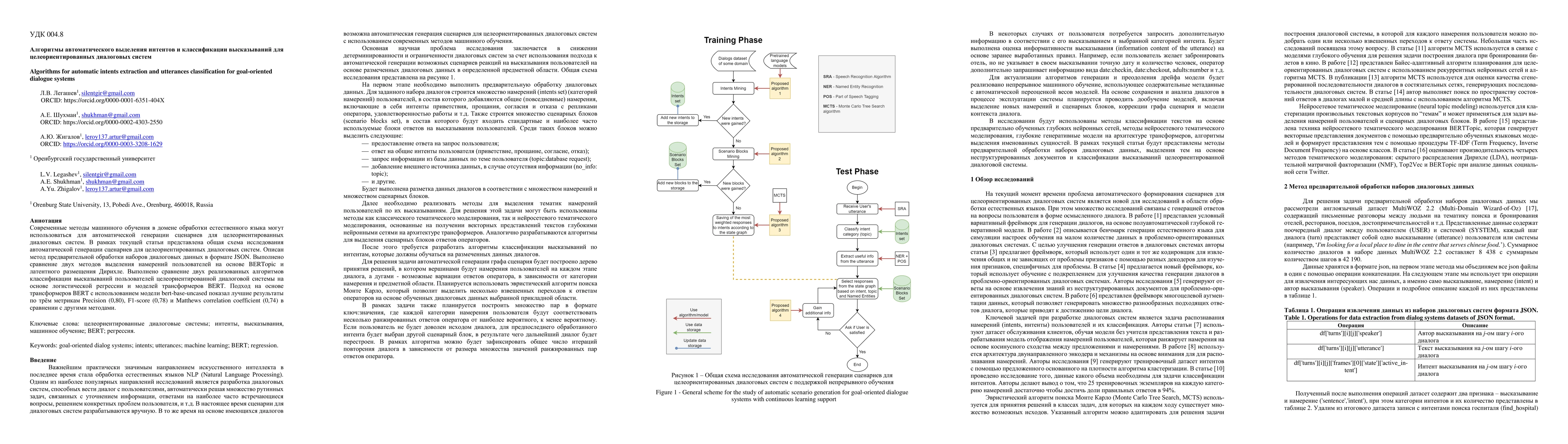 Modern machine learning techniques in the natural language processing domain can be used to automatically generate scripts for goal-oriented dialogue systems. The current article presents a general framework for studying the automatic generation of scripts for goal-oriented dialogue systems. A method for preprocessing dialog data sets in JSON format is described. A comparison is made of two methods for extracting user intent based on BERTopic and latent Dirichlet allocation. A comparison has been made of two implemented algorithms for classifying statements of users of a goal-oriented dialogue system based on logistic regression and BERT transformer models. The BERT transformer approach using the bert-base-uncased model showed better results for the three metrics Precision (0.80), F1-score (0.78) and Matthews correlation coefficient (0.74) in comparison with other methods.