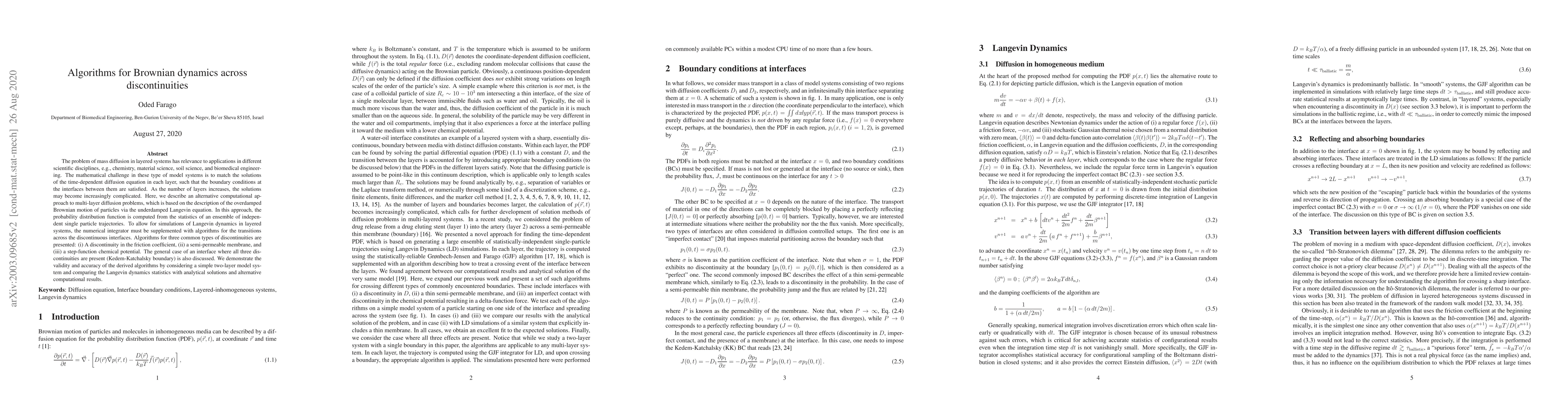 The problem of mass diffusion in layered systems has relevance to applications in different scientific disciplines, e.g., chemistry, material science, soil science, and biomedical engineering. The mathematical challenge in these type of model systems is to match the solutions of the time-dependent diffusion equation in each layer, such that the boundary conditions at the interfaces between them are satisfied. As the number of layers increases, the solutions may become increasingly complicated. Here, we describe an alternative computational approach to multi-layer diffusion problems, which is based on the description of the overdamped Brownian motion of particles via the underdamped Langevin equation. In this approach, the probability distribution function is computed from the statistics of an ensemble of independent single particle trajectories. To allow for simulations of Langevin dynamics in layered systems, the numerical integrator must be supplemented with algorithms for the transitions across the discontinuous interfaces. Algorithms for three common types of discontinuities are presented: (i) A discontinuity in the friction coefficient, (ii) a semi-permeable membrane, and (iii) a step-function chemical potential. The general case of an interface where all three discontinuities are present (Kedem-Katchalsky boundary) is also discussed. We demonstrate the validity and accuracy of the derived algorithms by considering a simple two-layer model system and comparing the Langevin dynamics statistics with analytical solutions and alternative computational results.