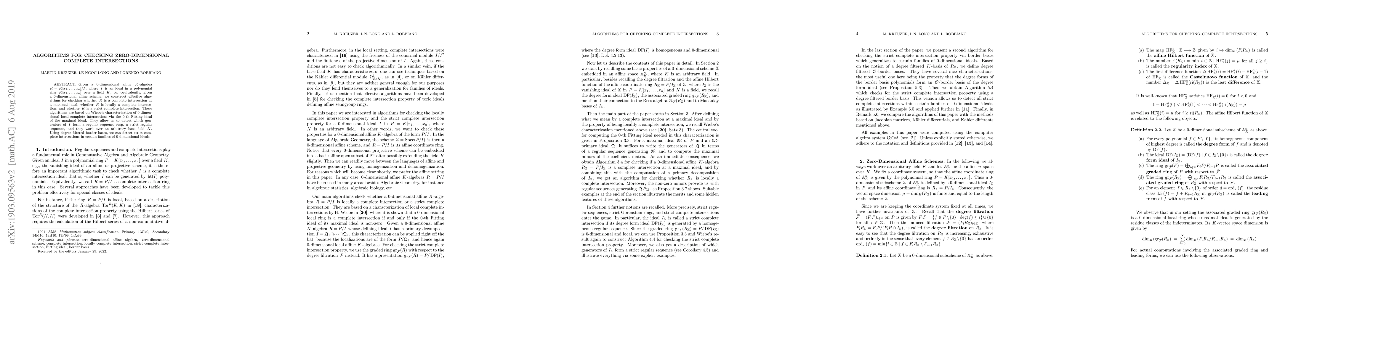 This paper presents algorithms to determine if a 0-dimensional affine algebra is a complete intersection, locally a complete intersection, or a strict complete intersection, leveraging Wiebe’s characterization and degree filtered border bases. The algorithms operate over any base field and detect regular sequences among the ideal's generators.