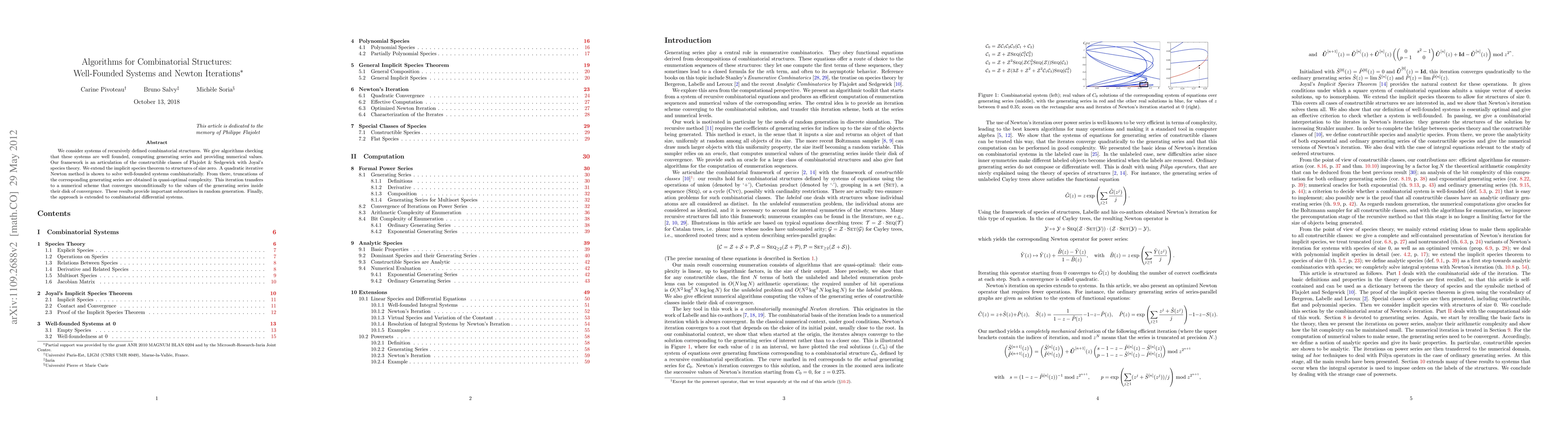 We consider systems of recursively defined combinatorial structures. We give algorithms checking that these systems are well founded, computing generating series and providing numerical values. Our framework is an articulation of the constructible classes of Flajolet and Sedgewick with Joyal's species theory. We extend the implicit species theorem to structures of size zero. A quadratic iterative Newton method is shown to solve well-founded systems combinatorially. From there, truncations of the corresponding generating series are obtained in quasi-optimal complexity. This iteration transfers to a numerical scheme that converges unconditionally to the values of the generating series inside their disk of convergence. These results provide important subroutines in random generation. Finally, the approach is extended to combinatorial differential systems.