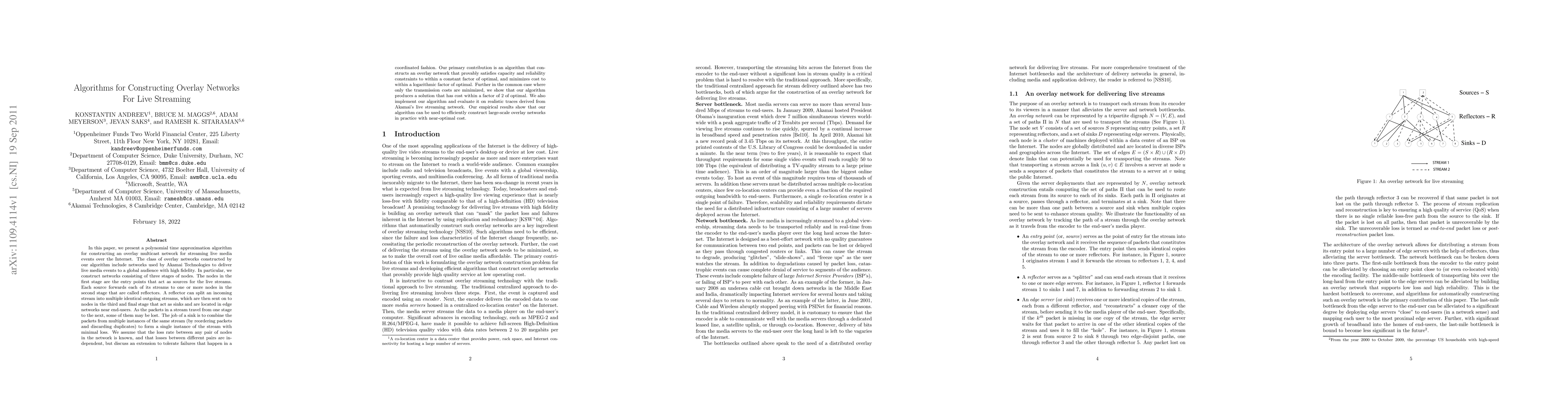 The paper presents a polynomial time approximation algorithm for constructing an overlay multicast network for live media streaming, utilizing a three-stage network structure with sources, reflectors, and sinks to manage stream transmission, loss, and reassembly.