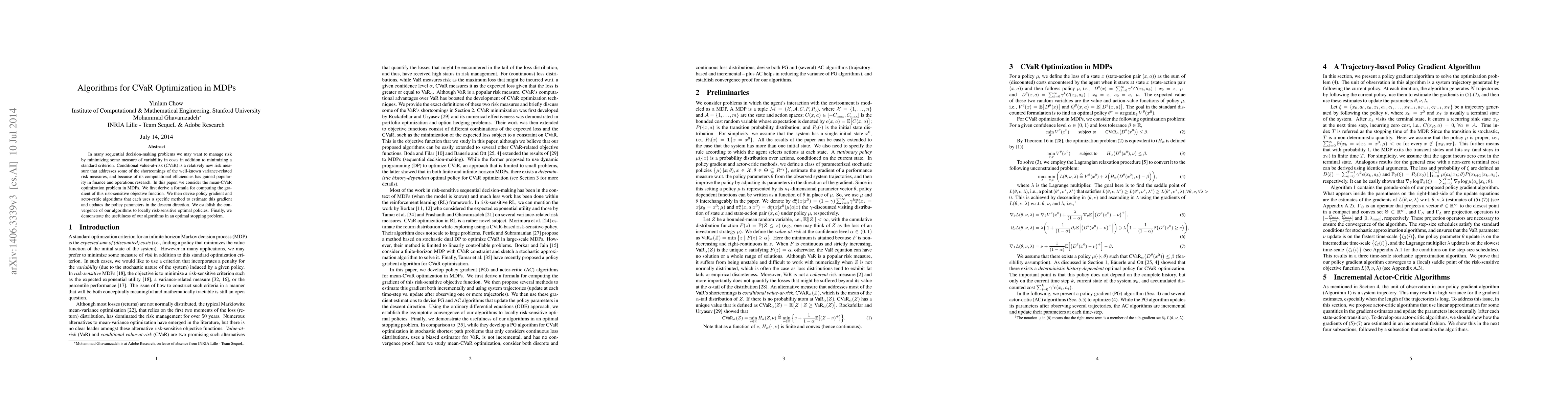 In many sequential decision-making problems we may want to manage risk by minimizing some measure of variability in costs in addition to minimizing a standard criterion. Conditional value-at-risk (CVaR) is a relatively new risk measure that addresses some of the shortcomings of the well-known variance-related risk measures, and because of its computational efficiencies has gained popularity in finance and operations research. In this paper, we consider the mean-CVaR optimization problem in MDPs. We first derive a formula for computing the gradient of this risk-sensitive objective function. We then devise policy gradient and actor-critic algorithms that each uses a specific method to estimate this gradient and updates the policy parameters in the descent direction. We establish the convergence of our algorithms to locally risk-sensitive optimal policies. Finally, we demonstrate the usefulness of our algorithms in an optimal stopping problem.