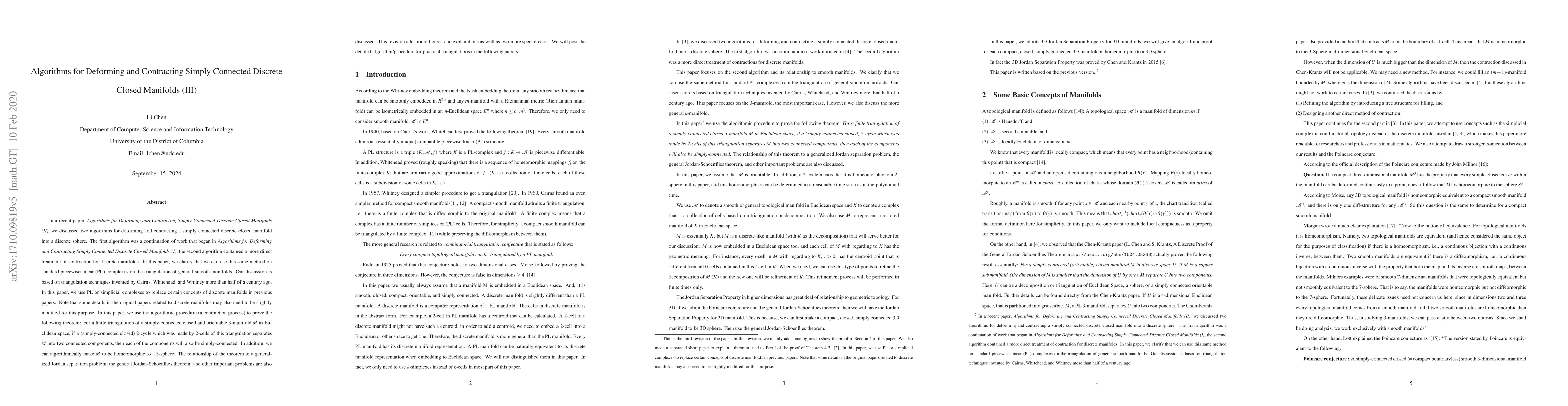 This paper builds on previous work to extend algorithms for deforming and contracting simply connected discrete closed manifolds into a discrete sphere, now applying these methods to standard piecewise linear complexes on the triangulation of general smooth manifolds. The authors prove that if a 2-cycle in a triangulation separates a simply-connected closed 3-manifold into two components, each component remains simply-connected, and the entire manifold can be homeomorphically transformed into a 3-sphere.