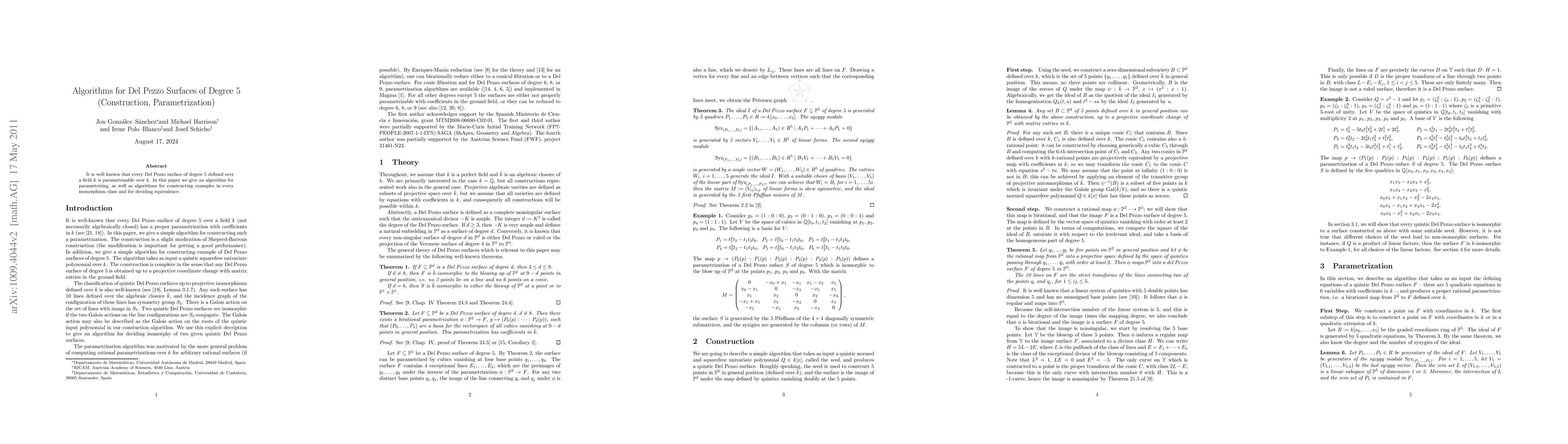 It is well known that every Del Pezzo surface of degree 5 defined over k is parametrizable over k. In this paper we give an efficient construction for parametrizing, as well as algorithms for constructing examples in every isomorphism class and for deciding equivalence.