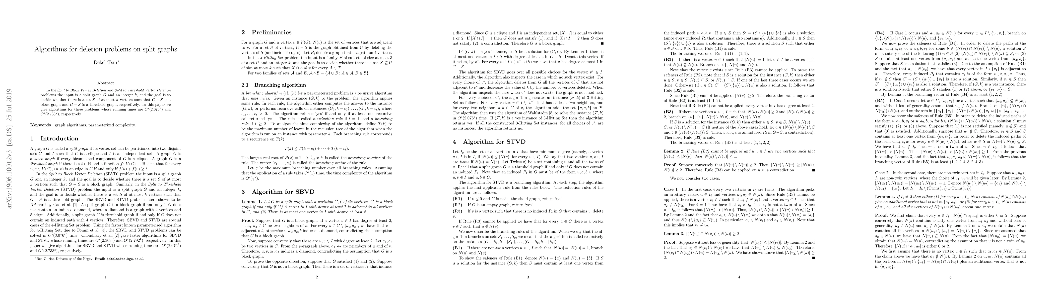 This paper presents efficient algorithms for the Split to Block Vertex Deletion and Split to Threshold Vertex Deletion problems on split graphs, achieving running times of $O^*(2.076^k)$ and $O^*(2.733^k)$, respectively.