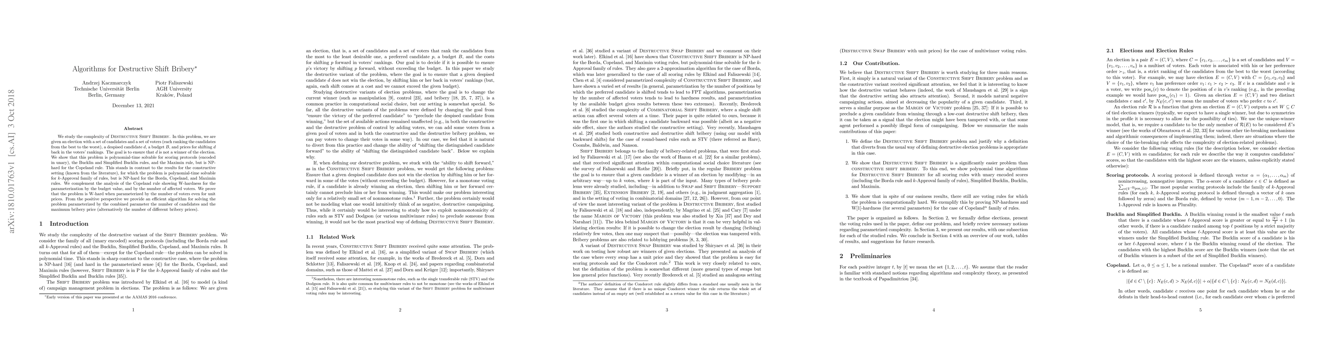 The paper investigates the complexity of Destructive Shift Bribery, a problem where voters can bribe candidates to avoid winning an election. It finds that certain rules have polynomial-time solutions while others remain NP-hard or W-hard, with some variations offering efficient algorithms.