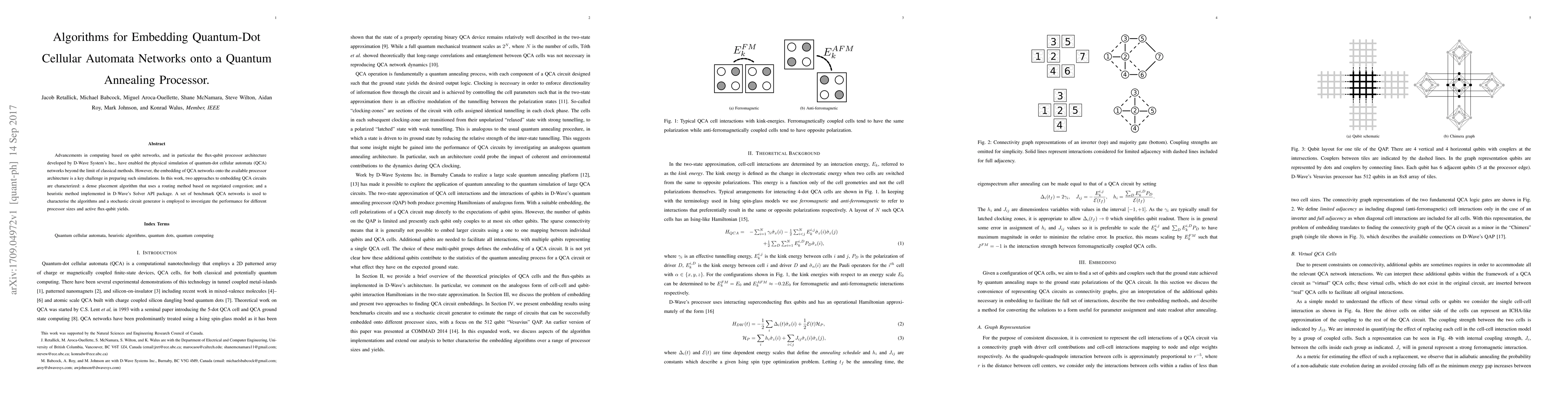 This paper explores two algorithms for embedding quantum-dot cellular automata (QCA) networks onto a quantum annealing processor, evaluating a dense placement method and a heuristic approach implemented via D-Wave's Solver API. Benchmark networks and stochastic circuit generation are used to assess performance across various processor sizes and flux-qubit yields.