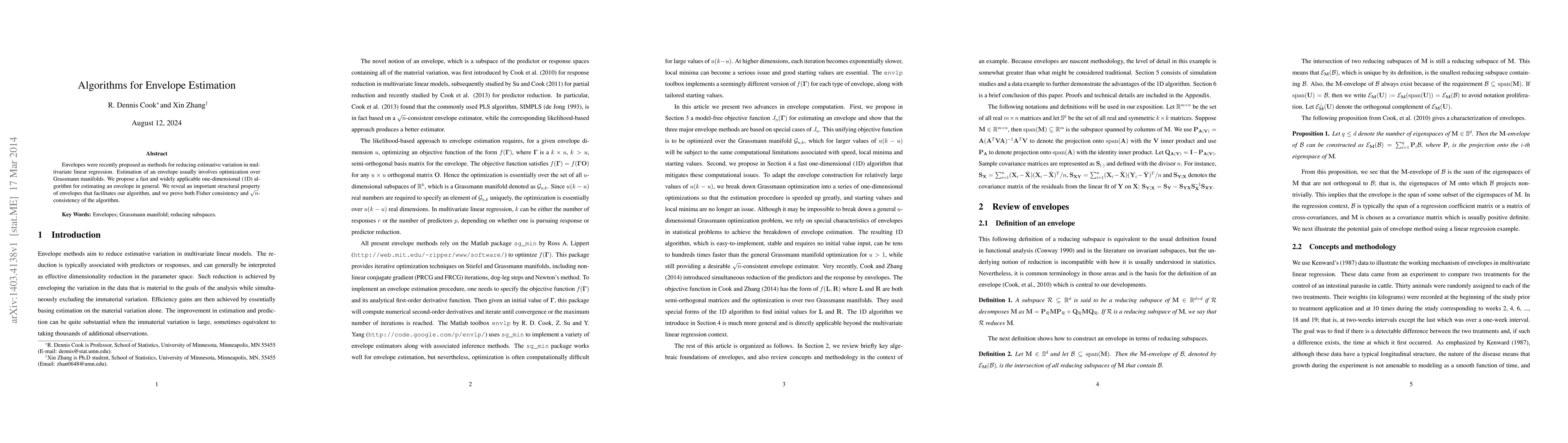 This paper proposes a fast one-dimensional algorithm for estimating envelopes in multivariate linear regression, which reduces estimative variation. The algorithm leverages a structural property of envelopes and demonstrates Fisher consistency and root-n-consistency.