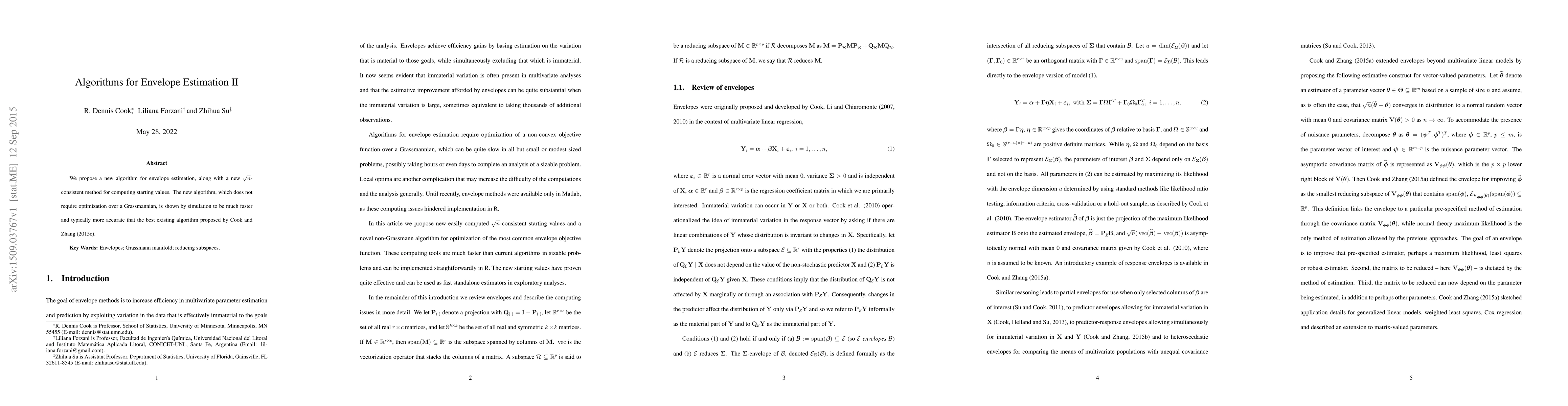 This paper introduces a novel algorithm for envelope estimation that is faster and more accurate than the existing best method, while also presenting a new root n consistent approach for computing starting values without optimization over a Grassmannian. Simulation results demonstrate its superior performance.