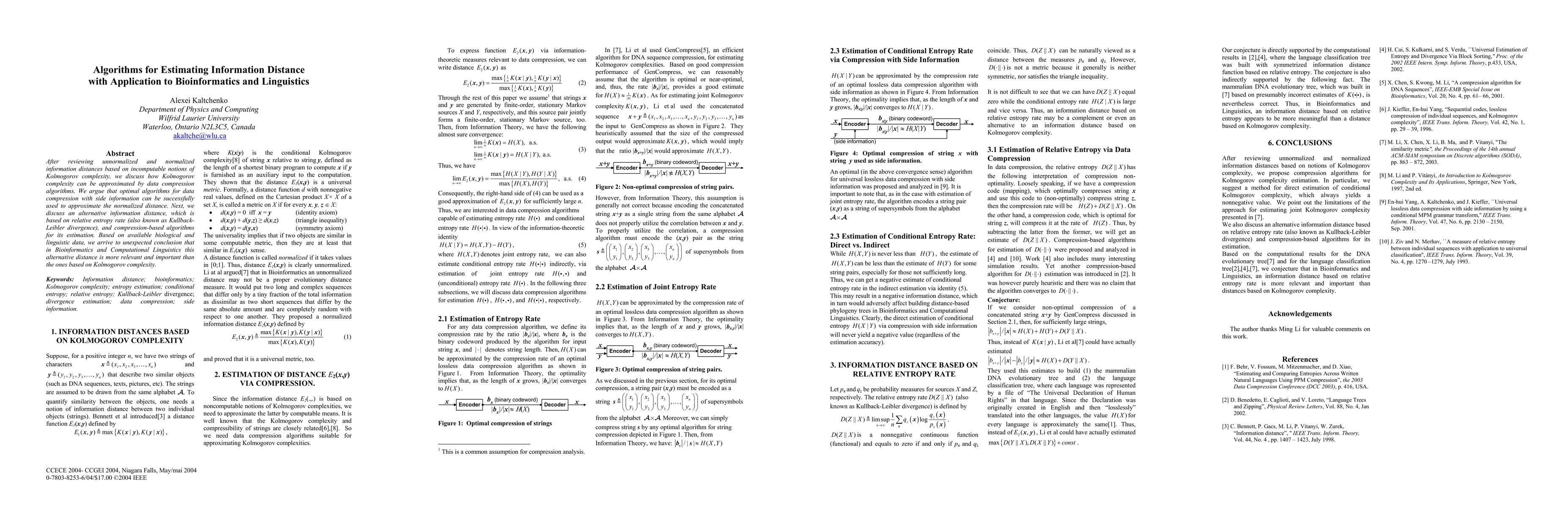 After reviewing unnormalized and normalized information distances based on incomputable notions of Kolmogorov complexity, we discuss how Kolmogorov complexity can be approximated by data compression algorithms. We argue that optimal algorithms for data compression with side information can be successfully used to approximate the normalized distance. Next, we discuss an alternative information distance, which is based on relative entropy rate (also known as Kullback-Leibler divergence), and compression-based algorithms for its estimation. Based on available biological and linguistic data, we arrive to unexpected conclusion that in Bioinformatics and Computational Linguistics this alternative distance is more relevant and important than the ones based on Kolmogorov complexity.