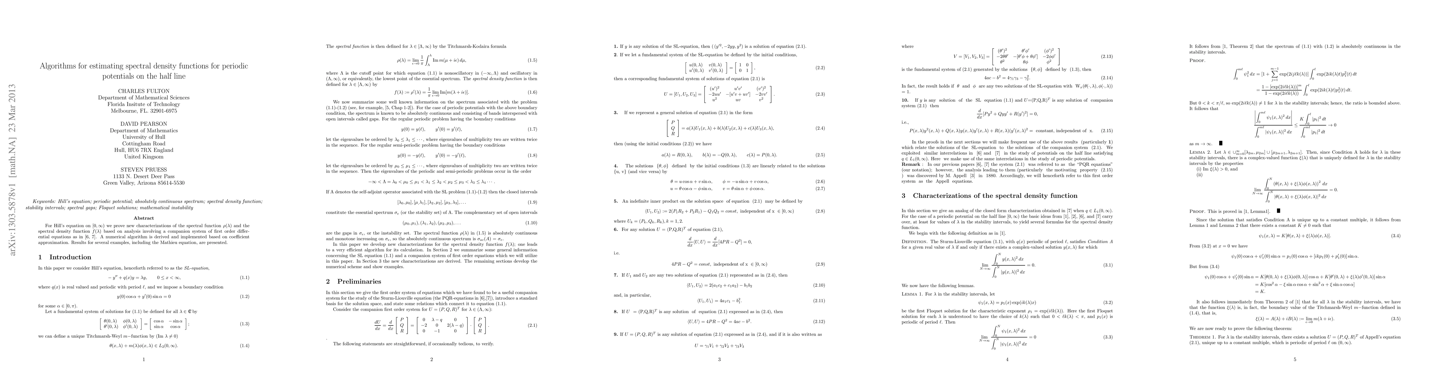 For Hill's equation on [0,infinity) we prove new characterizations of the spectral function rho(lambda) and the spectral density function f(lambda) based on analysis involving a companion system of first order differential equations in [6,7]. A numerical algorithm is derived and implemented based on coefficient approximation. Results for several examples, including the Mathieu equation, are presented.