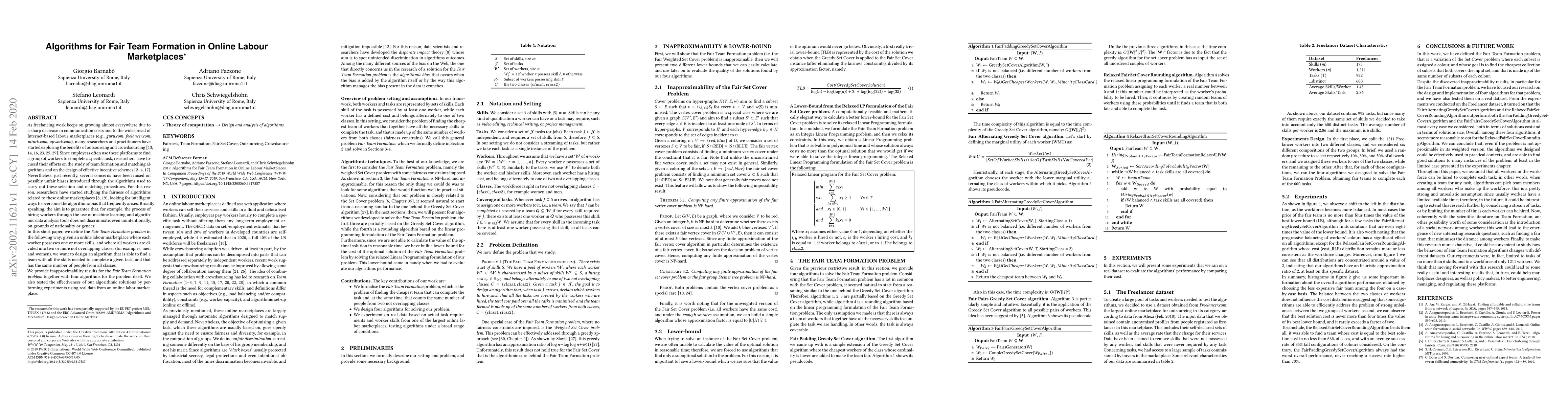 As freelancing work keeps on growing almost everywhere due to a sharp decrease in communication costs and to the widespread of Internet-based labour marketplaces (e.g., guru.com, feelancer.com, mturk.com, upwork.com), many researchers and practitioners have started exploring the benefits of outsourcing and crowdsourcing. Since employers often use these platforms to find a group of workers to complete a specific task, researchers have focused their efforts on the study of team formation and matching algorithms and on the design of effective incentive schemes. Nevertheless, just recently, several concerns have been raised on possibly unfair biases introduced through the algorithms used to carry out these selection and matching procedures. For this reason, researchers have started studying the fairness of algorithms related to these online marketplaces, looking for intelligent ways to overcome the algorithmic bias that frequently arises. Broadly speaking, the aim is to guarantee that, for example, the process of hiring workers through the use of machine learning and algorithmic data analysis tools does not discriminate, even unintentionally, on grounds of nationality or gender. In this short paper, we define the Fair Team Formation problem in the following way: given an online labour marketplace where each worker possesses one or more skills, and where all workers are divided into two or more not overlapping classes (for examples, men and women), we want to design an algorithm that is able to find a team with all the skills needed to complete a given task, and that has the same number of people from all classes. We provide inapproximability results for the Fair Team Formation problem together with four algorithms for the problem itself. We also tested the effectiveness of our algorithmic solutions by performing experiments using real data from an online labor marketplace.