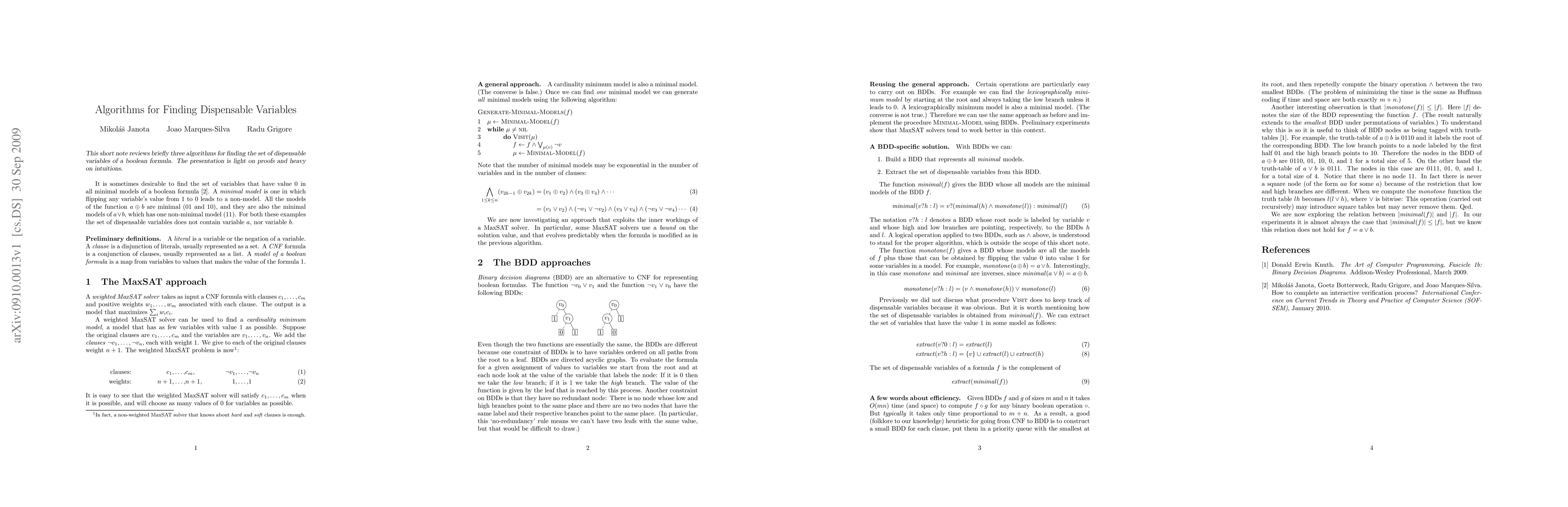 This paper reviews three algorithms for finding dispensable variables in boolean formulas, focusing on intuitions rather than rigorous proofs, to help identify unnecessary variables in logical expressions.