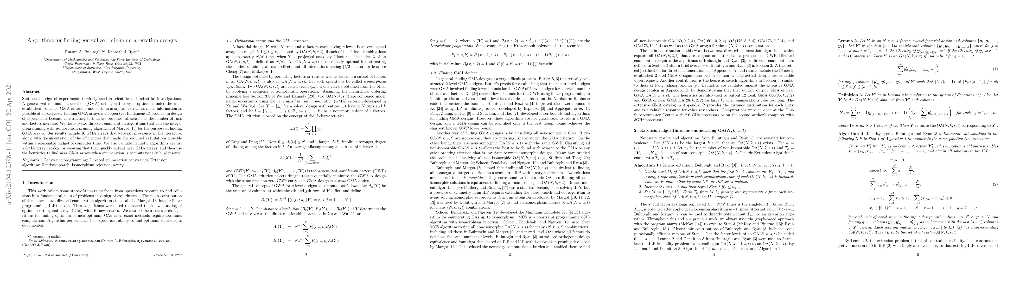 Statistical design of experiments is widely used in scientific and industrial investigations. A generalized minimum aberration (GMA) orthogonal array is optimum under the well-established, so-called GMA criterion, and such an array can extract as much information as possible at a fixed cost. Finding GMA arrays is an open (yet fundamental) problem in design of experiments because constructing such arrays becomes intractable as the number of runs and factors increase. We develop two directed enumeration algorithms that call the integer programming with isomorphism pruning algorithm of Margot (2007) for the purpose of finding GMA arrays. Our results include 16 GMA arrays that were not previously in the literature, along with documentation of the efficiencies that made the required calculations possible within a reasonable budget of computer time. We also validate heuristic algorithms against a GMA array catalog, by showing that they quickly output near GMA arrays, and then use the heuristics to find near GMA arrays when enumeration is computationally burdensome.
