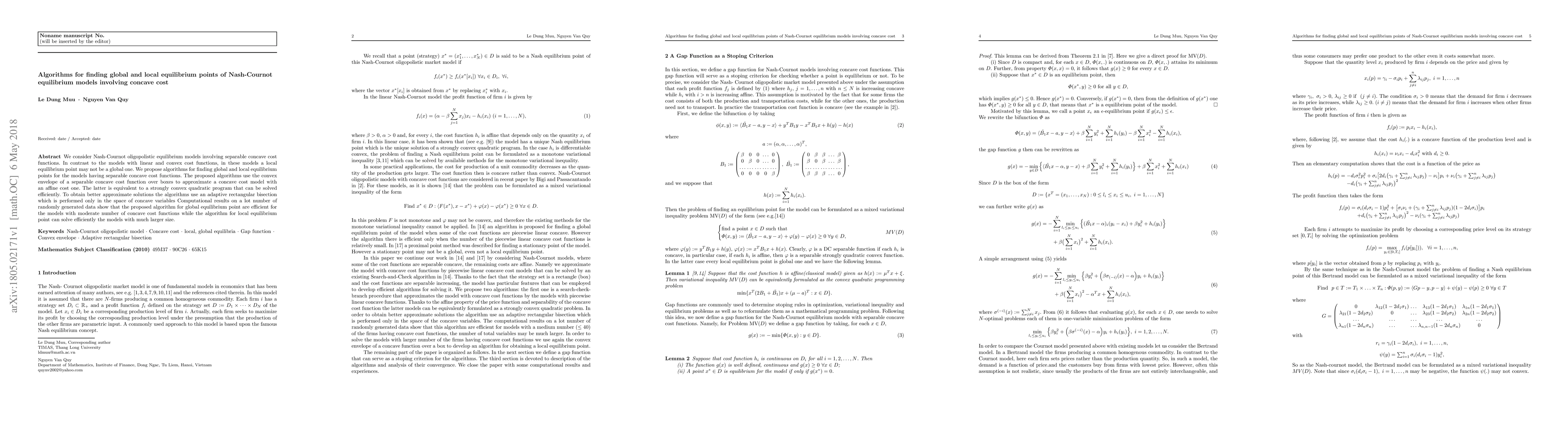 This paper proposes algorithms to find global and local equilibrium points in Nash-Cournot models with separable concave cost functions, addressing the challenge that local equilibria may not be global. The algorithms use convex envelopes and adaptive rectangular bisection to approximate and solve these models efficiently.