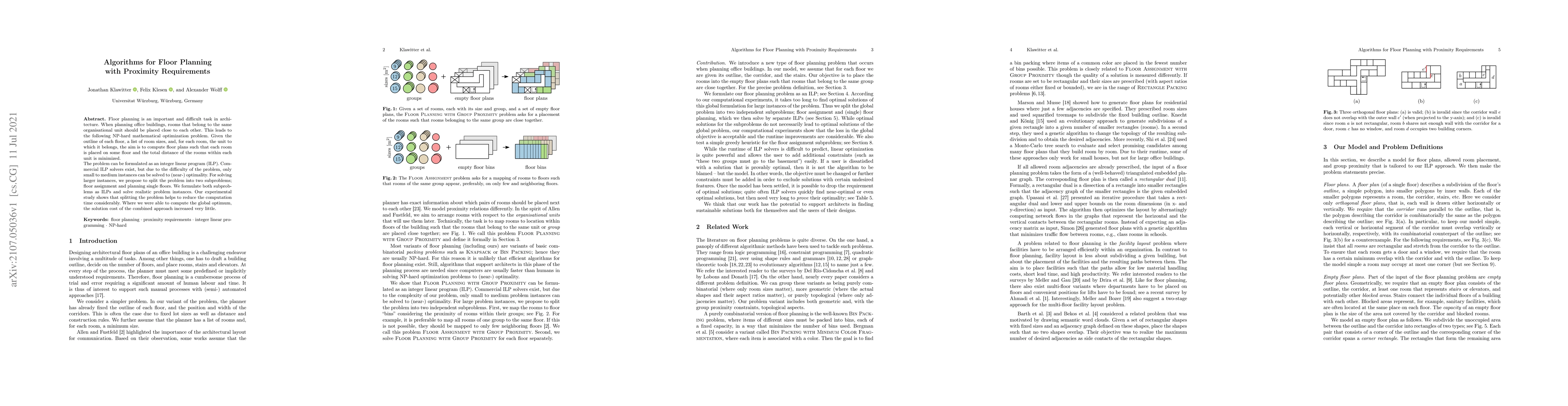 Floor planning is an important and difficult task in architecture. When planning office buildings, rooms that belong to the same organisational unit should be placed close to each other. This leads to the following NP-hard mathematical optimization problem. Given the outline of each floor, a list of room sizes, and, for each room, the unit to which it belongs, the aim is to compute floor plans such that each room is placed on some floor and the total distance of the rooms within each unit is minimized. The problem can be formulated as an integer linear program (ILP). Commercial ILP solvers exist, but due to the difficulty of the problem, only small to medium instances can be solved to (near-) optimality. For solving larger instances, we propose to split the problem into two subproblems; floor assignment and planning single floors. We formulate both subproblems as ILPs and solve realistic problem instances. Our experimental study shows that the problem helps to reduce the computation time considerably. Where we were able to compute the global optimum, the solution cost of the combined approach increased very little.