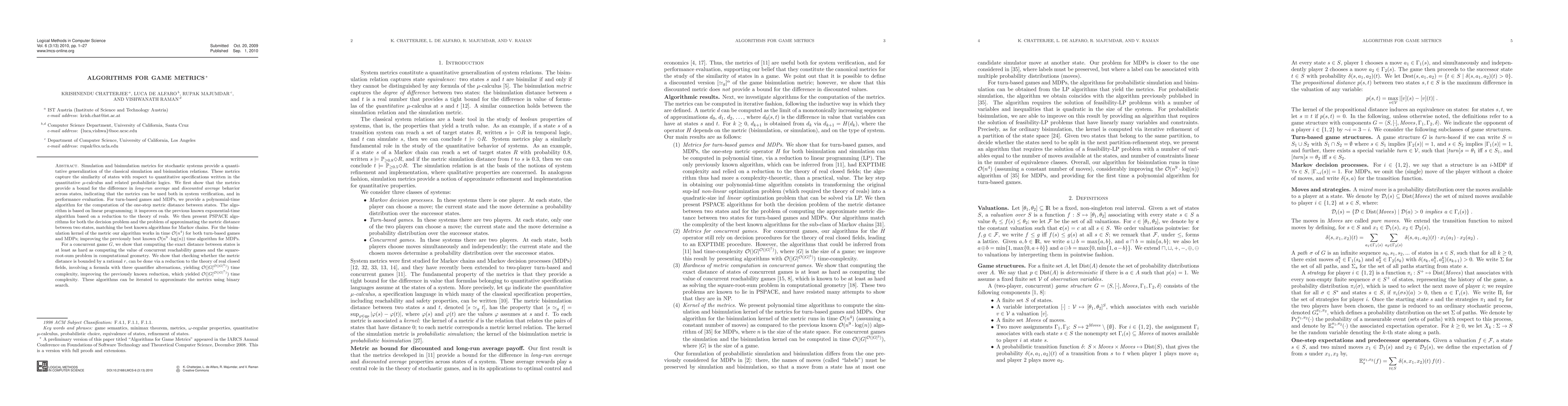 The paper presents algorithms for game metrics, specifically for simulation and bisimulation relations, using quantitative μ-calculus and related probabilistic logics. It introduces linear programming-based polynomial-time algorithms for computing one-step metric distances in turn-based games and Markov Decision Processes (MDPs).