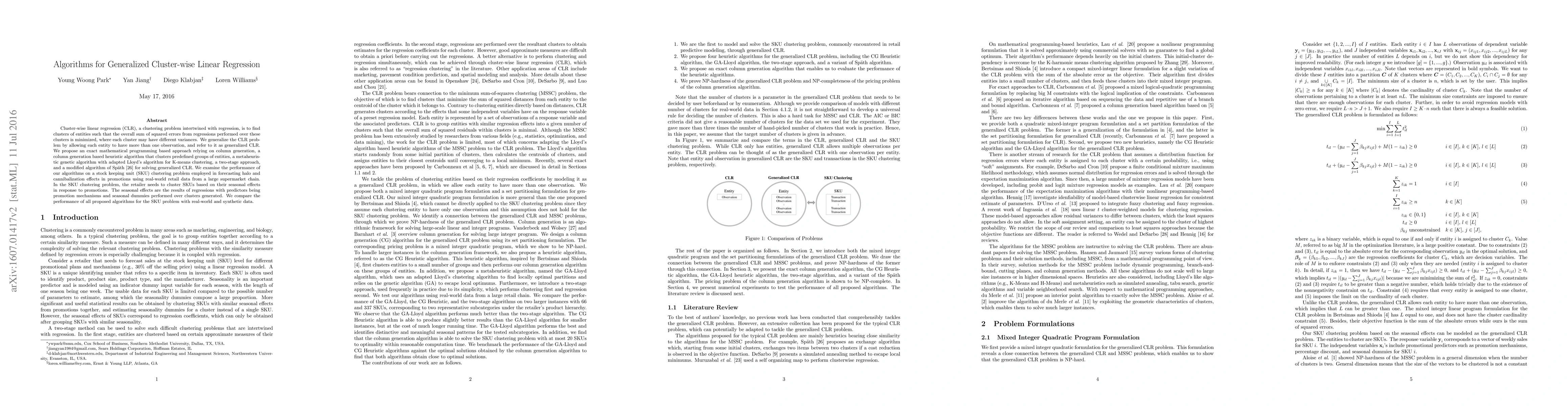Cluster-wise linear regression (CLR), a clustering problem intertwined with regression, is to find clusters of entities such that the overall sum of squared errors from regressions performed over these clusters is minimized, where each cluster may have different variances. We generalize the CLR problem by allowing each entity to have more than one observation, and refer to it as generalized CLR. We propose an exact mathematical programming based approach relying on column generation, a column generation based heuristic algorithm that clusters predefined groups of entities, a metaheuristic genetic algorithm with adapted Lloyd's algorithm for K-means clustering, a two-stage approach, and a modified algorithm of Sp{\"a}th \cite{Spath1979} for solving generalized CLR. We examine the performance of our algorithms on a stock keeping unit (SKU) clustering problem employed in forecasting halo and cannibalization effects in promotions using real-world retail data from a large supermarket chain. In the SKU clustering problem, the retailer needs to cluster SKUs based on their seasonal effects in response to promotions. The seasonal effects are the results of regressions with predictors being promotion mechanisms and seasonal dummies performed over clusters generated. We compare the performance of all proposed algorithms for the SKU problem with real-world and synthetic data.