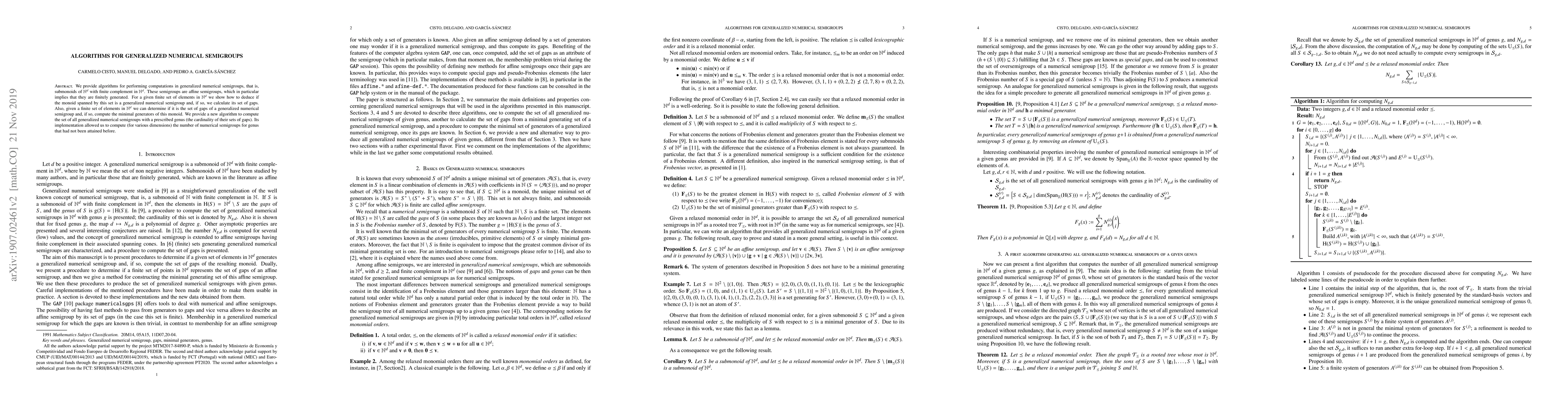 This paper presents algorithms for computing properties of generalized numerical semigroups, including determining if a given set of elements spans such a semigroup, calculating the set of gaps, and finding minimal generators. It also introduces a new algorithm to enumerate semigroups by their genus, enabling the computation of previously unknown counts for various dimensions.