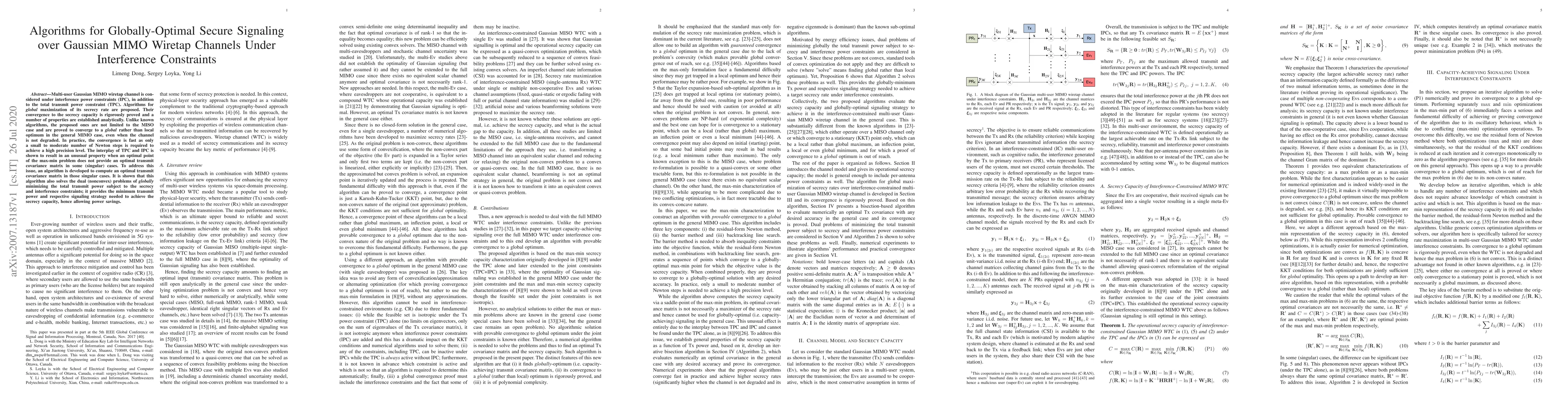This paper proposes algorithms for globally optimal secure signaling over multi-user Gaussian MIMO wiretap channels under both interference and total transmit power constraints. The algorithms are shown to converge to the secrecy capacity and achieve global rather than local optima, even in non-degraded channels.