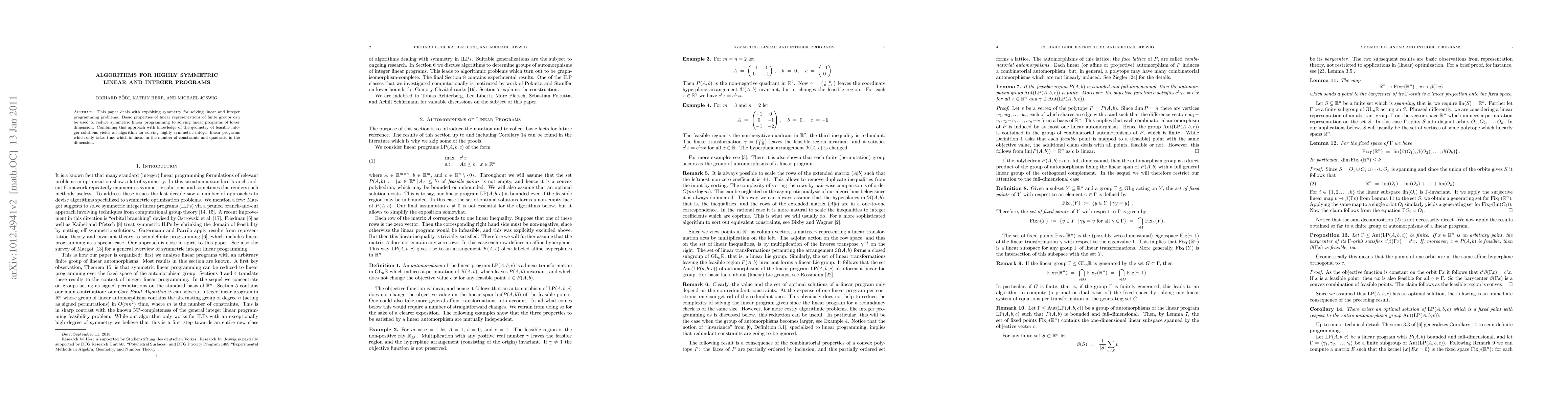 The paper explores algorithms for solving highly symmetric linear and integer programs by leveraging symmetry properties and reducing dimensions using linear representations of finite groups.