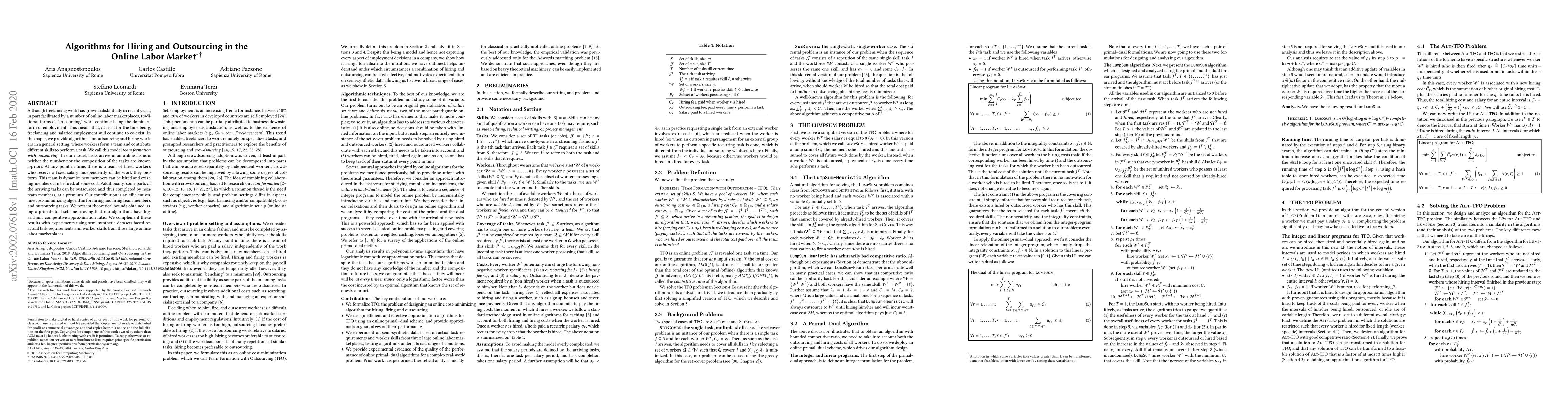 This paper develops algorithms for optimizing hiring and outsourcing in online labor markets where tasks arrive dynamically. It presents an efficient online algorithm with a logarithmic competitive approximation ratio for managing a dynamic team of workers and outsourcing tasks to minimize costs.
