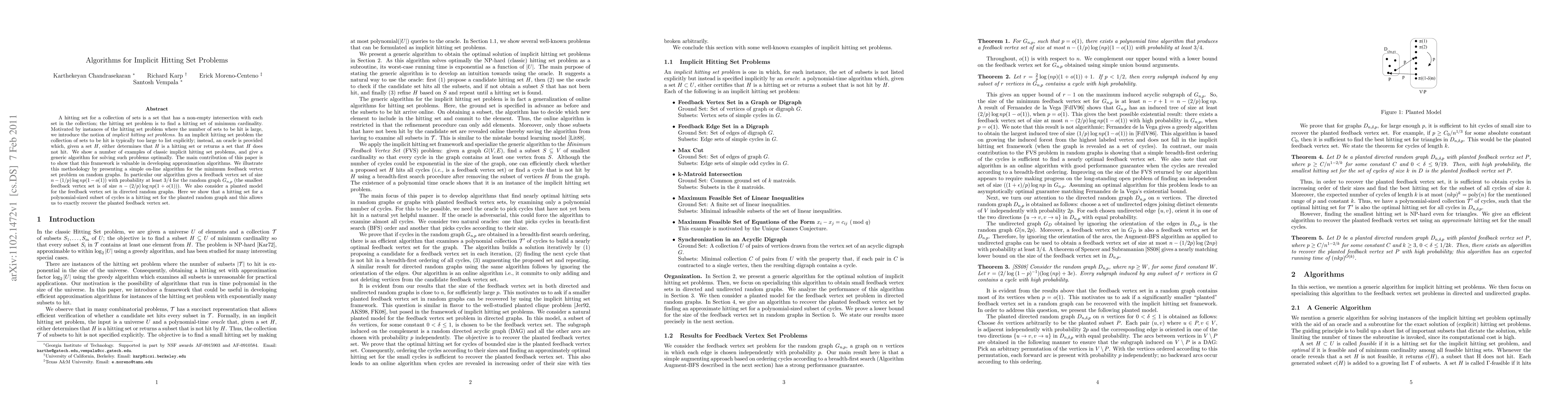 A hitting set for a collection of sets is a set that has a non-empty intersection with each set in the collection; the hitting set problem is to find a hitting set of minimum cardinality. Motivated by instances of the hitting set problem where the number of sets to be hit is large, we introduce the notion of implicit hitting set problems. In an implicit hitting set problem the collection of sets to be hit is typically too large to list explicitly; instead, an oracle is provided which, given a set H, either determines that H is a hitting set or returns a set that H does not hit. We show a number of examples of classic implicit hitting set problems, and give a generic algorithm for solving such problems optimally. The main contribution of this paper is to show that this framework is valuable in developing approximation algorithms. We illustrate this methodology by presenting a simple on-line algorithm for the minimum feedback vertex set problem on random graphs. In particular our algorithm gives a feedback vertex set of size n-(1/p)\log{np}(1-o(1)) with probability at least 3/4 for the random graph G_{n,p} (the smallest feedback vertex set is of size n-(2/p)\log{np}(1+o(1))). We also consider a planted model for the feedback vertex set in directed random graphs. Here we show that a hitting set for a polynomial-sized subset of cycles is a hitting set for the planted random graph and this allows us to exactly recover the planted feedback vertex set.