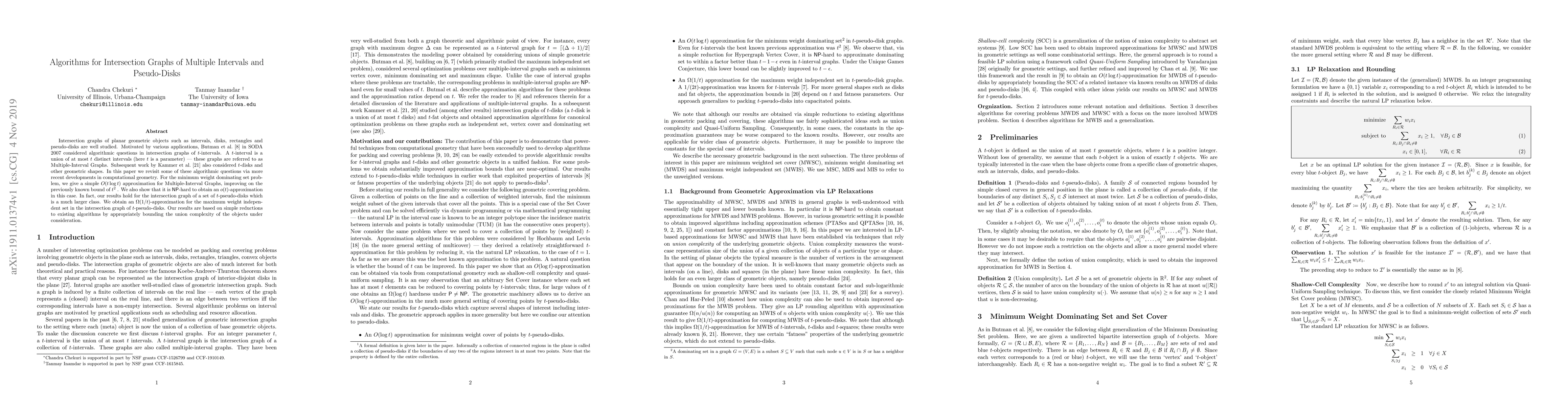 Intersection graphs of planar geometric objects such as intervals, disks, rectangles and pseudo-disks are well studied. Motivated by various applications, Butman et al. in SODA 2007 considered algorithmic questions in intersection graphs of $t$-intervals. A $t$-interval is a union of at most $t$ distinct intervals (here $t$ is a parameter) -- these graphs are referred to as Multiple-Interval Graphs. Subsequent work by Kammer et al. in Approx 2010 also considered $t$-disks and other geometric shapes. In this paper we revisit some of these algorithmic questions via more recent developments in computational geometry. For the minimum weight dominating set problem, we give a simple $O(t \log t)$ approximation for Multiple-Interval Graphs, improving on the previously known bound of $t^2$ . We also show that it is NP-hard to obtain an $o(t)$-approximation in this case. In fact, our results hold for the intersection graph of a set of t-pseudo-disks which is a much larger class. We obtain an ${\Omega}(1/t)$-approximation for the maximum weight independent set in the intersection graph of $t$-pseudo-disks. Our results are based on simple reductions to existing algorithms by appropriately bounding the union complexity of the objects under consideration.