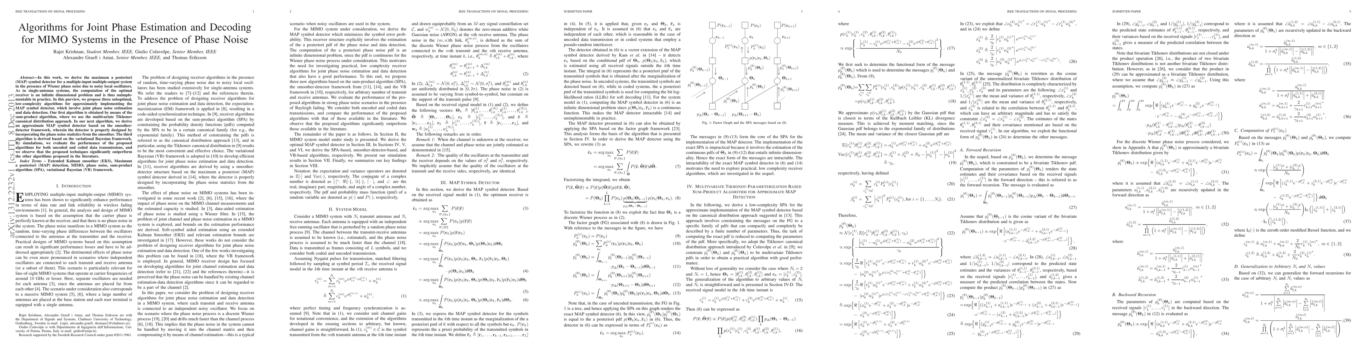 This paper proposes three low-complexity algorithms for joint phase noise estimation and decoding in MIMO systems affected by Wiener phase noise. The algorithms, derived using the sum-product algorithm, smoother-detector framework, and variational Bayesian framework, outperform existing methods in both uncoded and coded data transmissions.