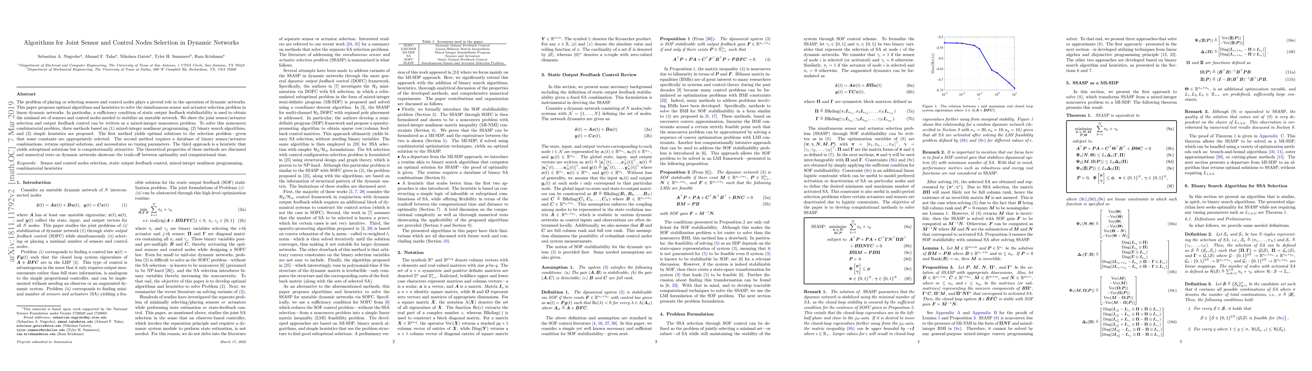 This paper presents algorithms for jointly selecting sensors and control nodes in dynamic networks, addressing the stabilization issue. It proposes three methods: mixed-integer nonlinear programming for optimal solutions, binary search algorithms for efficient computation, and heuristics for fast, suboptimal results. Numerical tests demonstrate the balance between solution quality and computational efficiency.