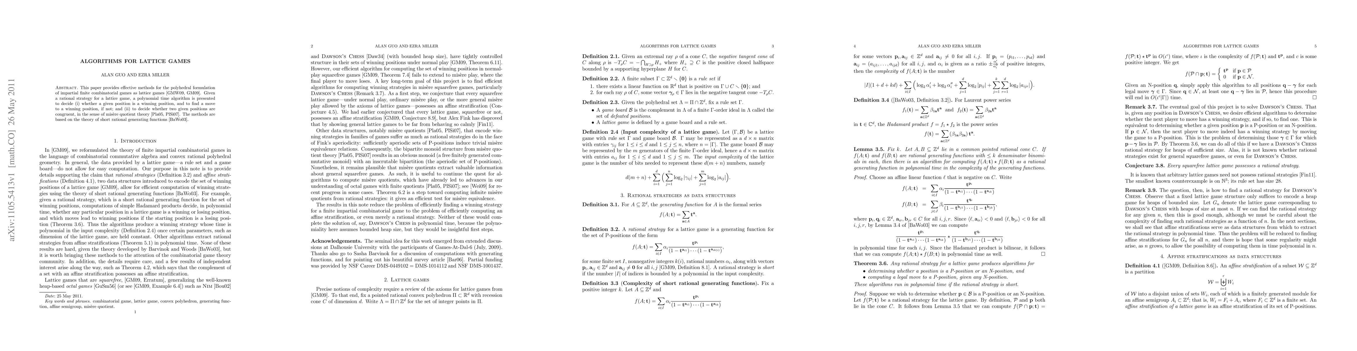 This paper provides effective methods for the polyhedral formulation of impartial finite combinatorial games as lattice games. Given a rational strategy for a lattice game, a polynomial time algorithm is presented to decide (i) whether a given position is a winning position, and to find a move to a winning position, if not; and (ii) to decide whether two given positions are congruent, in the sense of mis\`ere quotient theory. The methods are based on the theory of short rational generating functions.
