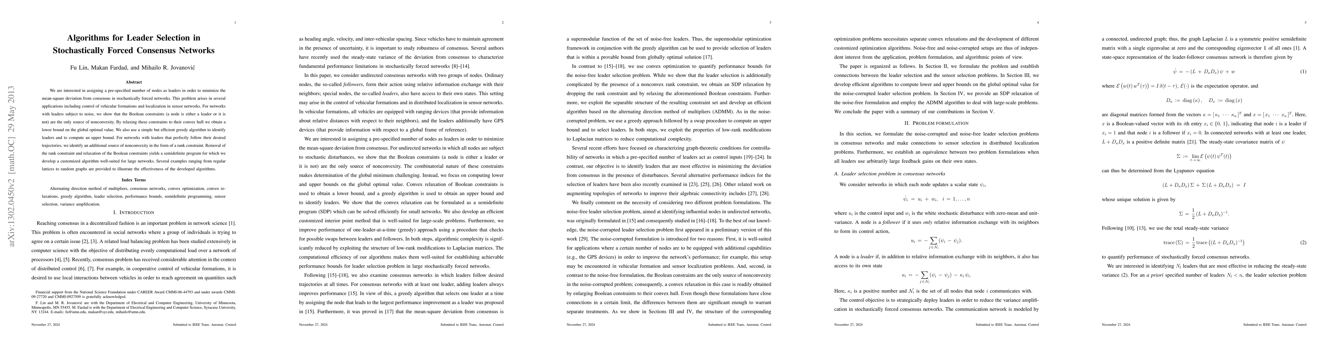 We are interested in assigning a pre-specified number of nodes as leaders in order to minimize the mean-square deviation from consensus in stochastically forced networks. This problem arises in several applications including control of vehicular formations and localization in sensor networks. For networks with leaders subject to noise, we show that the Boolean constraints (a node is either a leader or it is not) are the only source of nonconvexity. By relaxing these constraints to their convex hull we obtain a lower bound on the global optimal value. We also use a simple but efficient greedy algorithm to identify leaders and to compute an upper bound. For networks with leaders that perfectly follow their desired trajectories, we identify an additional source of nonconvexity in the form of a rank constraint. Removal of the rank constraint and relaxation of the Boolean constraints yields a semidefinite program for which we develop a customized algorithm well-suited for large networks. Several examples ranging from regular lattices to random graphs are provided to illustrate the effectiveness of the developed algorithms.
