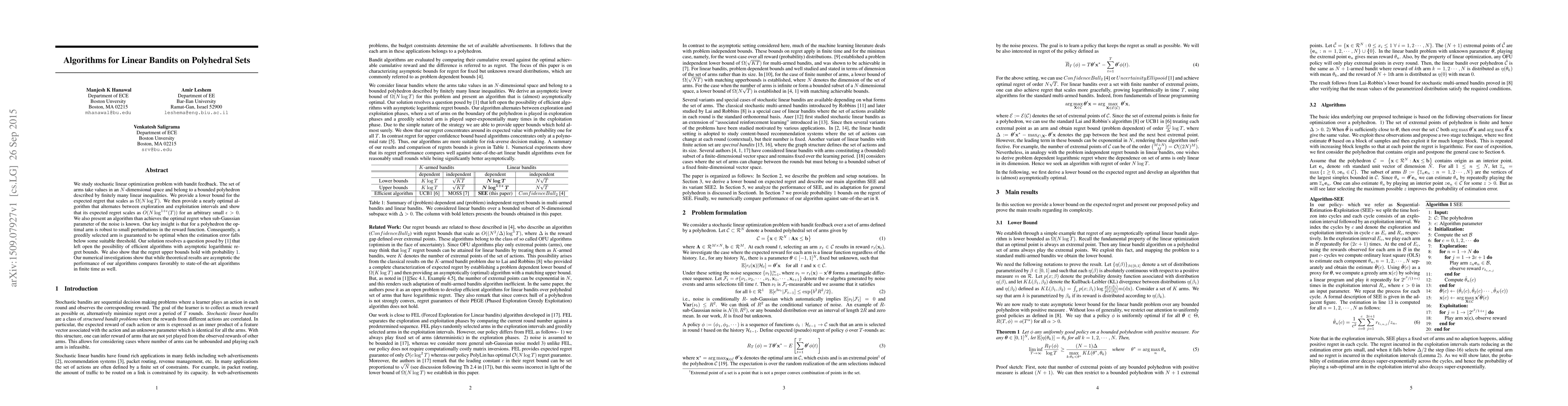 We study stochastic linear optimization problem with bandit feedback. The set of arms take values in an $N$-dimensional space and belong to a bounded polyhedron described by finitely many linear inequalities. We provide a lower bound for the expected regret that scales as $\Omega(N\log T)$. We then provide a nearly optimal algorithm and show that its expected regret scales as $O(N\log^{1+\epsilon}(T))$ for an arbitrary small $\epsilon >0$. The algorithm alternates between exploration and exploitation intervals sequentially where deterministic set of arms are played in the exploration intervals and greedily selected arm is played in the exploitation intervals. We also develop an algorithm that achieves the optimal regret when sub-Gaussianity parameter of the noise term is known. Our key insight is that for a polyhedron the optimal arm is robust to small perturbations in the reward function. Consequently, a greedily selected arm is guaranteed to be optimal when the estimation error falls below some suitable threshold. Our solution resolves a question posed by Rusmevichientong and Tsitsiklis (2011) that left open the possibility of efficient algorithms with asymptotic logarithmic regret bounds. We also show that the regret upper bounds hold with probability $1$. Our numerical investigations show that while theoretical results are asymptotic the performance of our algorithms compares favorably to state-of-the-art algorithms in finite time as well.