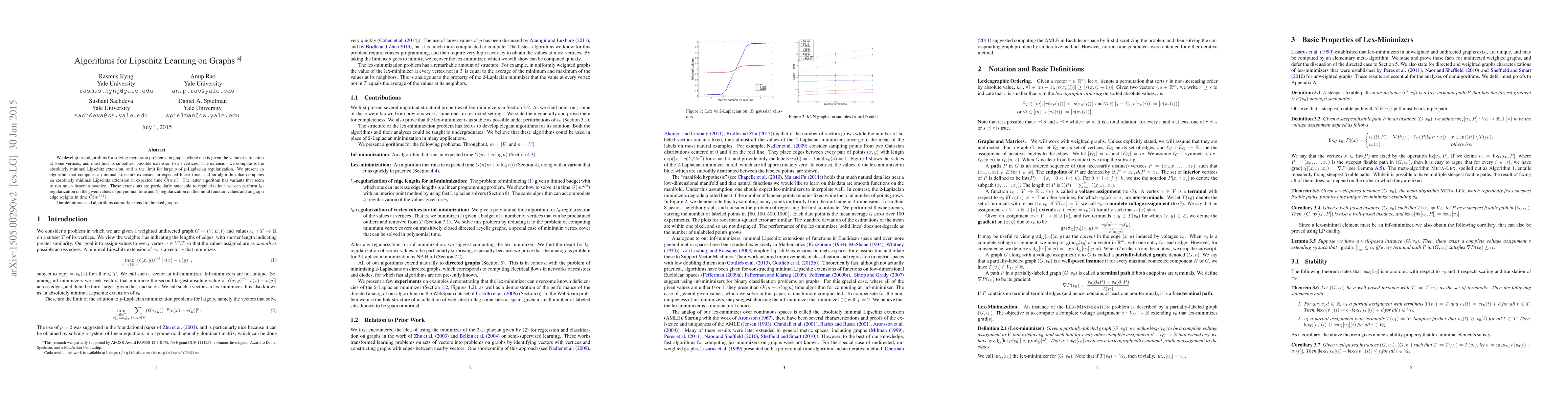 We develop fast algorithms for solving regression problems on graphs where one is given the value of a function at some vertices, and must find its smoothest possible extension to all vertices. The extension we compute is the absolutely minimal Lipschitz extension, and is the limit for large $p$ of $p$-Laplacian regularization. We present an algorithm that computes a minimal Lipschitz extension in expected linear time, and an algorithm that computes an absolutely minimal Lipschitz extension in expected time $\widetilde{O} (m n)$. The latter algorithm has variants that seem to run much faster in practice. These extensions are particularly amenable to regularization: we can perform $l_{0}$-regularization on the given values in polynomial time and $l_{1}$-regularization on the initial function values and on graph edge weights in time $\widetilde{O} (m^{3/2})$.