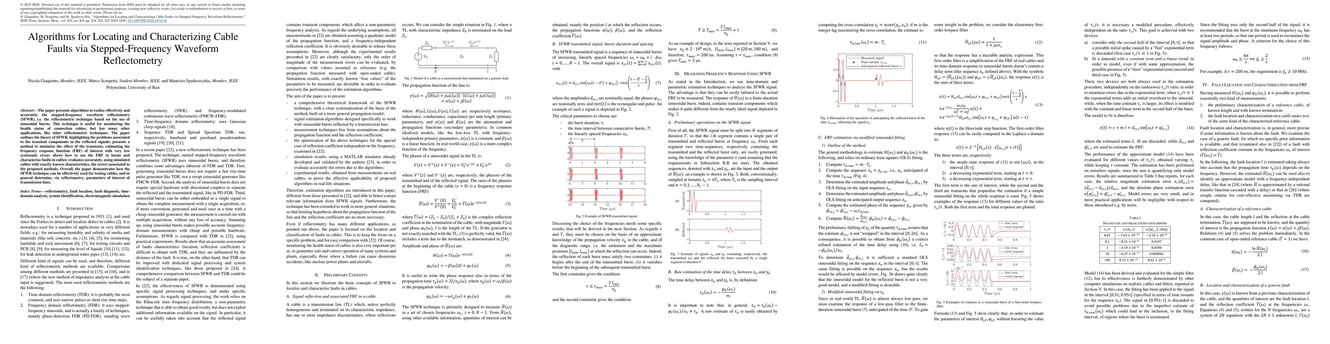 This paper develops algorithms for stepped-frequency waveform reflectometry (SFWR) to accurately locate and characterize cable faults. It minimizes transient effects to estimate the frequency response function (FRF) with low error, demonstrating the technique's efficacy for cable health monitoring and transmission line parameter determination.