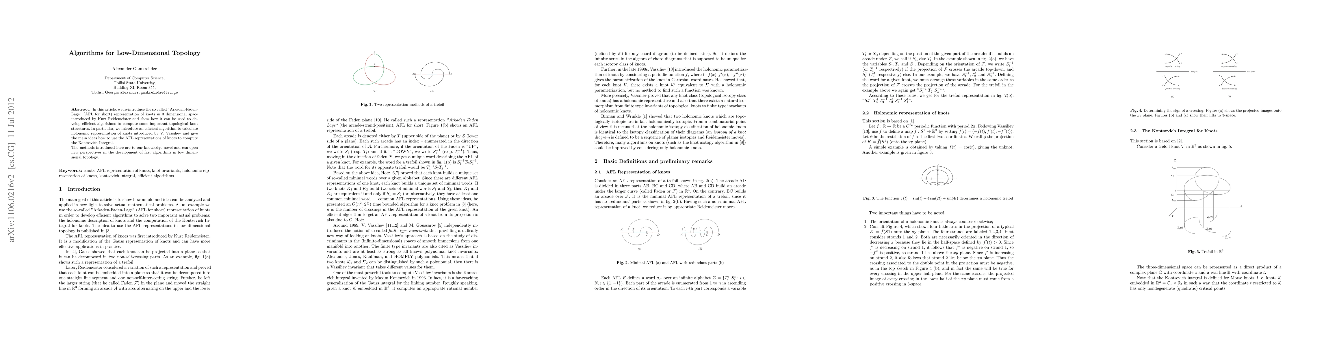 In this article, we re-introduce the so called "Arkaden-Faden-Lage" (AFL for short) representation of knots in 3 dimensional space introduced by Kurt Reidemeister and show how it can be used to develop efficient algorithms to compute some important topological knot structures. In particular, we introduce an efficient algorithm to calculate holonomic representation of knots introduced by V. Vassiliev and give the main ideas how to use the AFL representations of knots to compute the Kontsevich Integral. The methods introduced here are to our knowledge novel and can open new perspectives in the development of fast algorithms in low dimensional topology.
