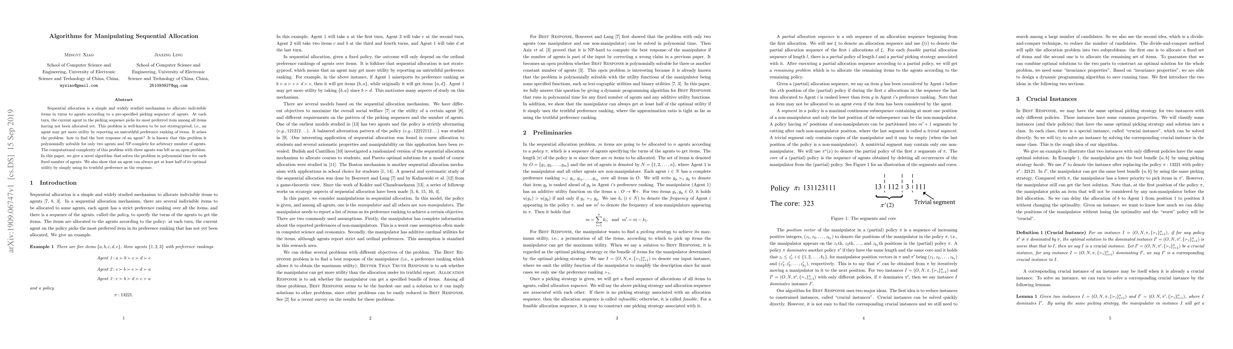 This paper presents a novel algorithm to solve the sequential allocation problem in polynomial time for any fixed number of agents, and demonstrates that an agent can achieve at least half of its optimal utility by reporting its truthful preference ranking.