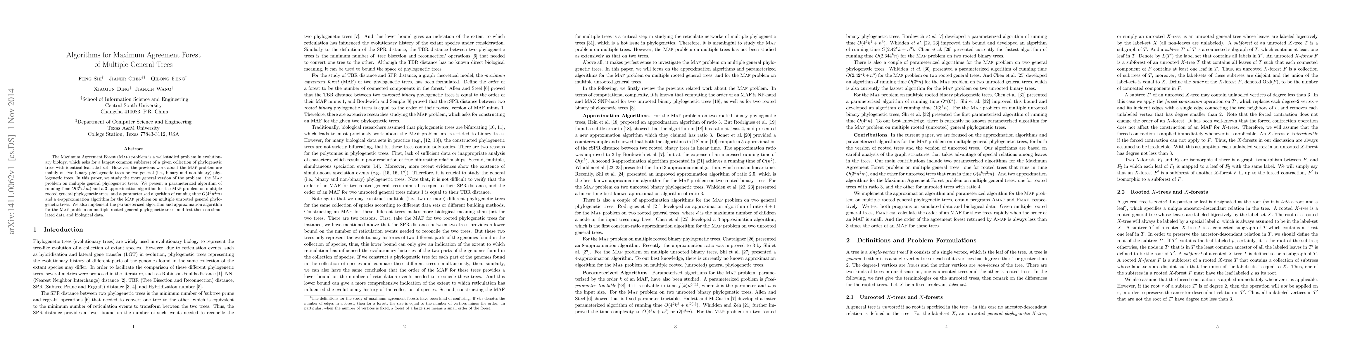 This paper presents algorithms for the Maximum Agreement Forest (Maf) problem across multiple general phylogenetic trees, introducing parameterized and approximation algorithms for both rooted and unrooted cases. The study extends previous research, which primarily focused on binary trees, and includes implementation and testing on both simulated and biological data.