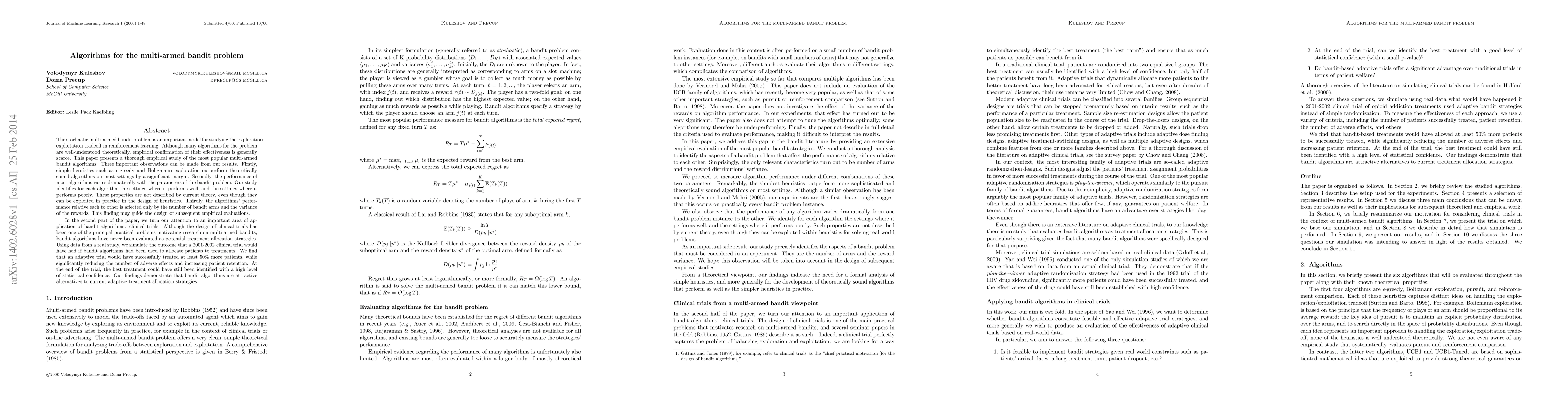 Although many algorithms for the multi-armed bandit problem are well-understood theoretically, empirical confirmation of their effectiveness is generally scarce. This paper presents a thorough empirical study of the most popular multi-armed bandit algorithms. Three important observations can be made from our results. Firstly, simple heuristics such as epsilon-greedy and Boltzmann exploration outperform theoretically sound algorithms on most settings by a significant margin. Secondly, the performance of most algorithms varies dramatically with the parameters of the bandit problem. Our study identifies for each algorithm the settings where it performs well, and the settings where it performs poorly. Thirdly, the algorithms' performance relative each to other is affected only by the number of bandit arms and the variance of the rewards. This finding may guide the design of subsequent empirical evaluations. In the second part of the paper, we turn our attention to an important area of application of bandit algorithms: clinical trials. Although the design of clinical trials has been one of the principal practical problems motivating research on multi-armed bandits, bandit algorithms have never been evaluated as potential treatment allocation strategies. Using data from a real study, we simulate the outcome that a 2001-2002 clinical trial would have had if bandit algorithms had been used to allocate patients to treatments. We find that an adaptive trial would have successfully treated at least 50% more patients, while significantly reducing the number of adverse effects and increasing patient retention. At the end of the trial, the best treatment could have still been identified with a high level of statistical confidence. Our findings demonstrate that bandit algorithms are attractive alternatives to current adaptive treatment allocation strategies.