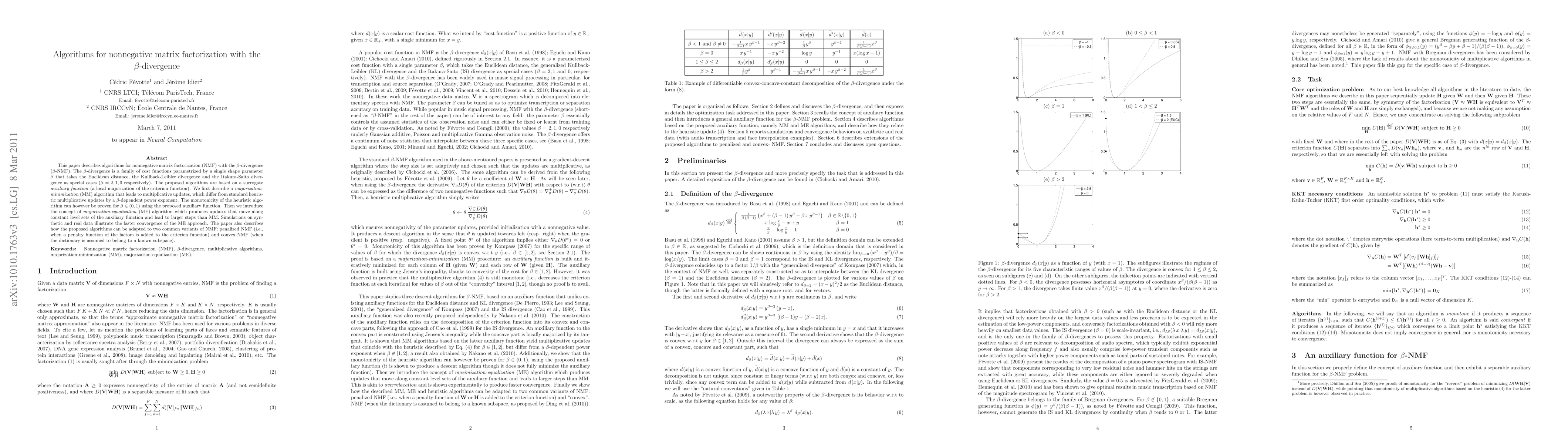 This paper proposes algorithms for nonnegative matrix factorization (NMF) using the beta-divergence, introducing majorization-minimization (MM) and majorization-equalization (ME) methods with faster convergence. The ME approach moves along constant level sets, achieving larger steps and better performance compared to standard multiplicative updates.