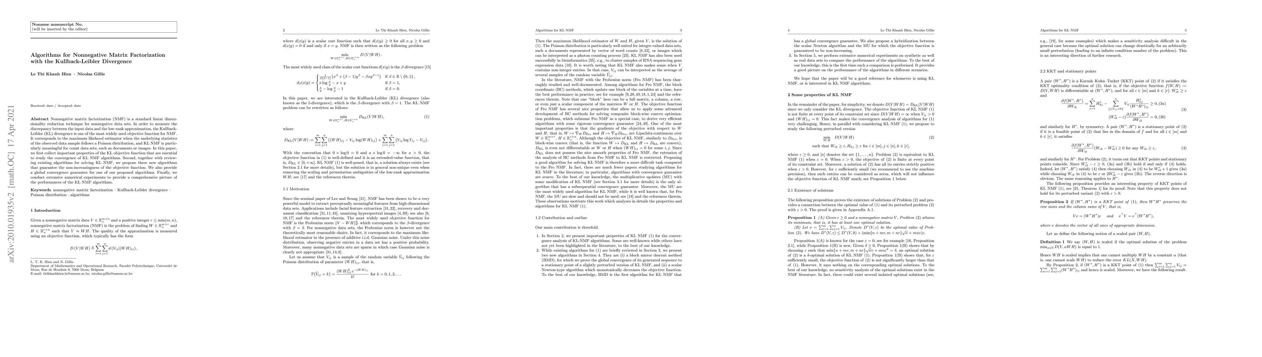 The paper presents new algorithms for Nonnegative Matrix Factorization (NMF) using the Kullback-Leibler (KL) divergence, analyzing properties of the KL objective function and proposing Block Mirror Descent (BMD) with global convergence guarantees, a scalar Newton-type (SN) algorithm ensuring non-increasing objective function, and a hybrid SN-MU algorithm.